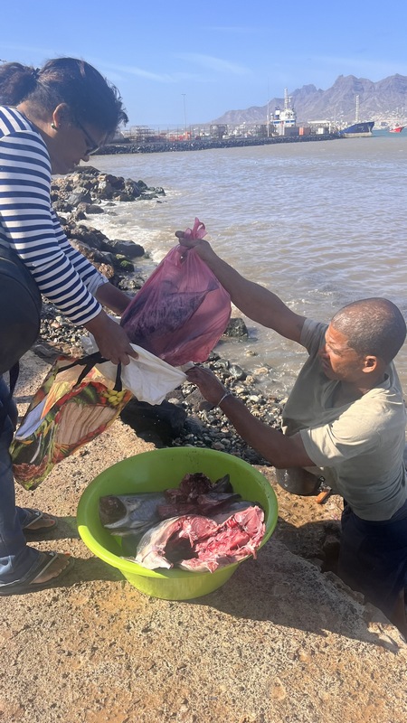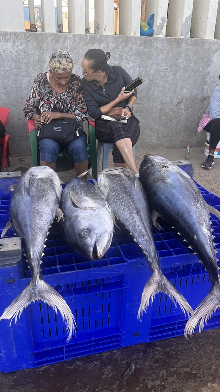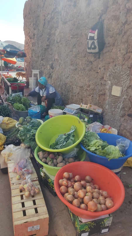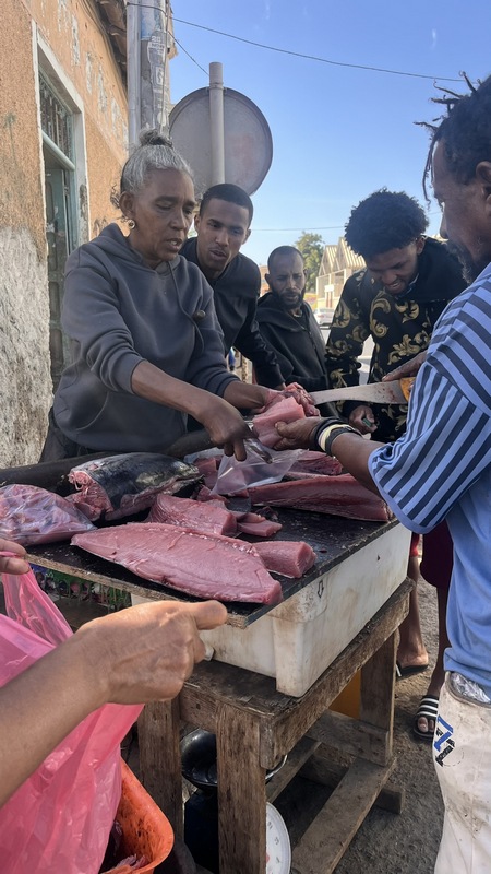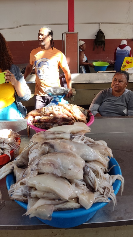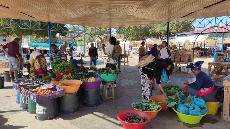 calabaceira (baobab), te de jengibre, sopa de pescado, pechuga de pollo con puré de yuca, 11€. Está bien, aunque las raciones podían ser más generosas. El mercado tiene salida en la
