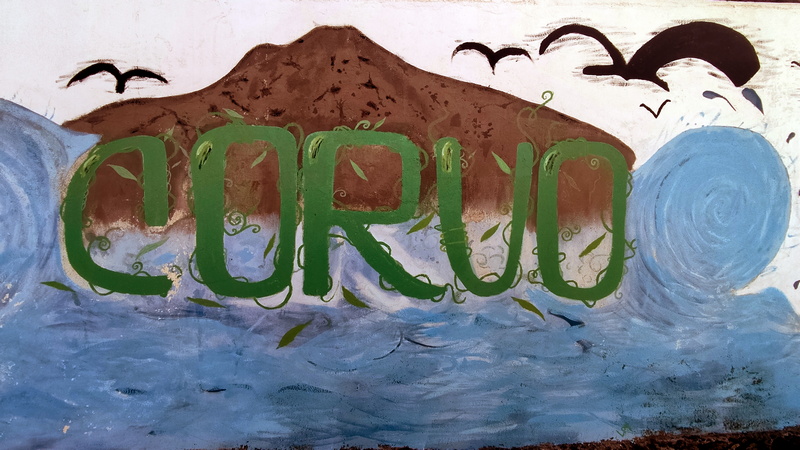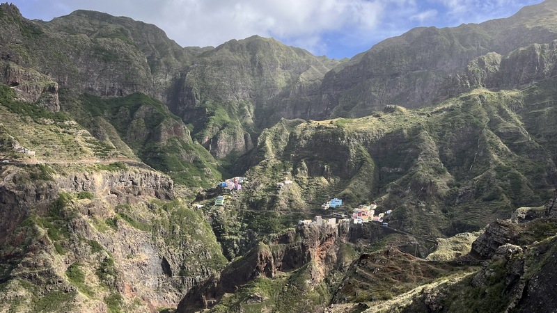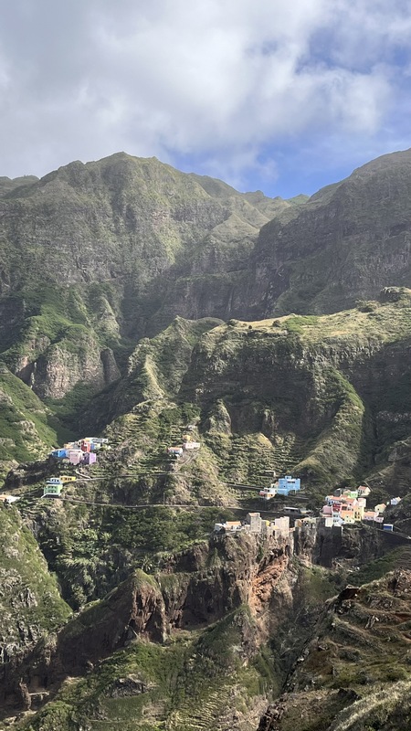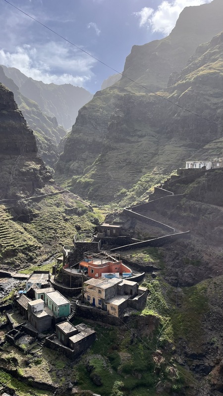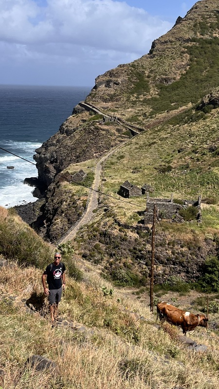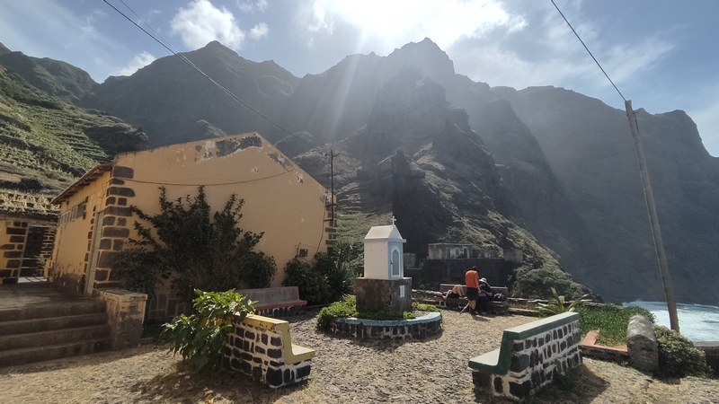 Un kilómetro después viene Corvo, un pueblecito desde donde empieza una exigente subida hasta Fontainhas, un grupillo de casas de colores encajadas en el cañón que forma la montaña frente al mar. Durante la ascensión pueden apreciarse las terrazas de cultivo, que haciendo equilibrios imposibles, invaden el valle. La exigente subida está amenizada por catorce pequeñas capillas con imágenes que nos recuerdan los catorce pasos del Vía Cruzis, al que tuvo la idea hay que reconocerle un fino sentido del humor. El final del pueblo conecta con la carretera, donde hay vehículos que recogen a algunos viajeros para ahorrarles los dos últimos kilómetros hasta Ponto do Sol. Por suerte aun nos quedan fuerzas para acabar el trayecto andando.
