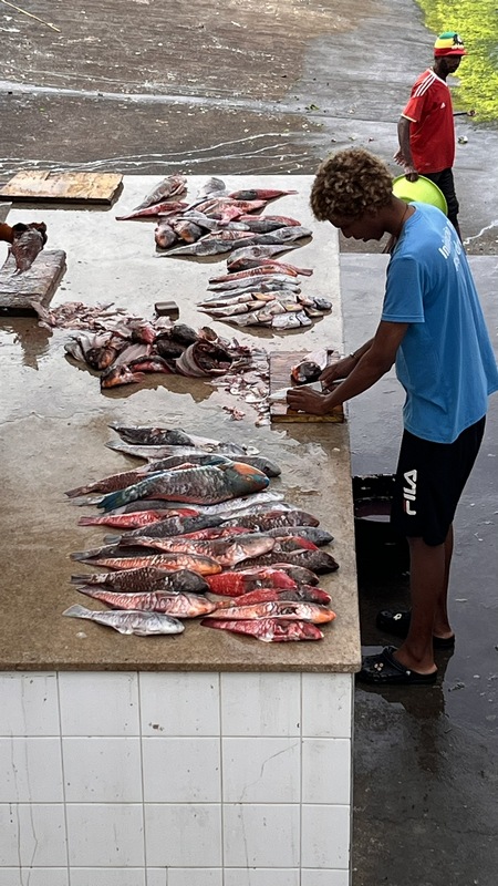 Mini Familiar, restaurante y mini mercado familiar detrás de la Camara Municipal. Comida excelente, solo siete mesas en una pequeña terraza. Cachupa con chorizo local y huevo, sopa de pescado, filete de atún con arroz y patatas fritas, púding de coco, dos cervezas, 2.400 escudos.