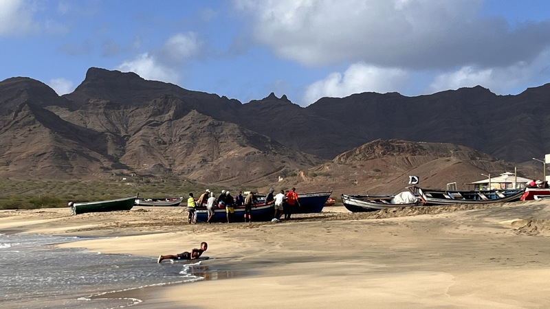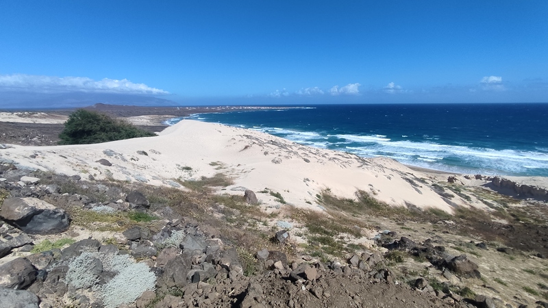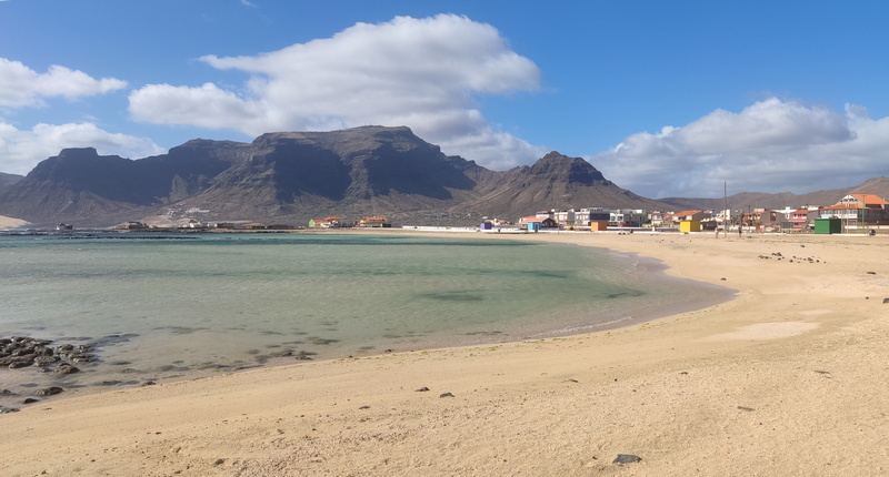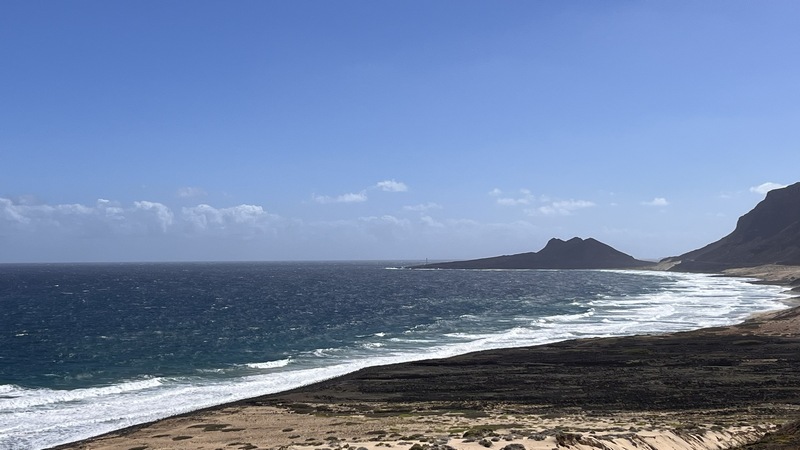 Poco más adelante, otro mirador, ofrece unas vistas espectaculares sobre Praia Grande, una amplia extensión de arena interminable bañada por olas grandes y fuertes corrientes. Un lugar aislado y de difícil acceso en comparación con otras playas próximas a núcleos de población, donde disfrutar del viento y la naturaleza a tus anchas. A 19 km de Mindelo se encuentra la aldea costera de Calhau, un pueblo de pescadores donde se encuentran algunas de las mejores playas de la isla. Al fondo, 10 km mar adentro, se ve la deshabitada isla de Santa Luzia.
