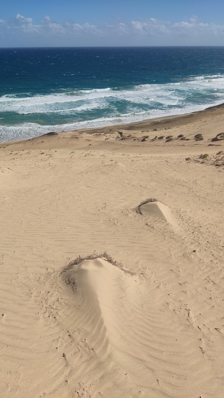 jet abierto, cómodo y en buen estado. La moto funciona bien, no nos da ningún problema. Gastamos 250 escudos en reponer la gasolina consumida. Escogimos un mal día para hacer el tour, pues pensábamos bañarnos en algunas playas, pero los vientos superan los 35 km/h, la arena se levanta y se te clava en las piernas, el mar está muy movido, incluso cuesta manejar la moto en algunos tramos. A pesar de todo mereció la pena. Las carreteras, aunque son de pavés en su mayoría, están en bastante buen estado.