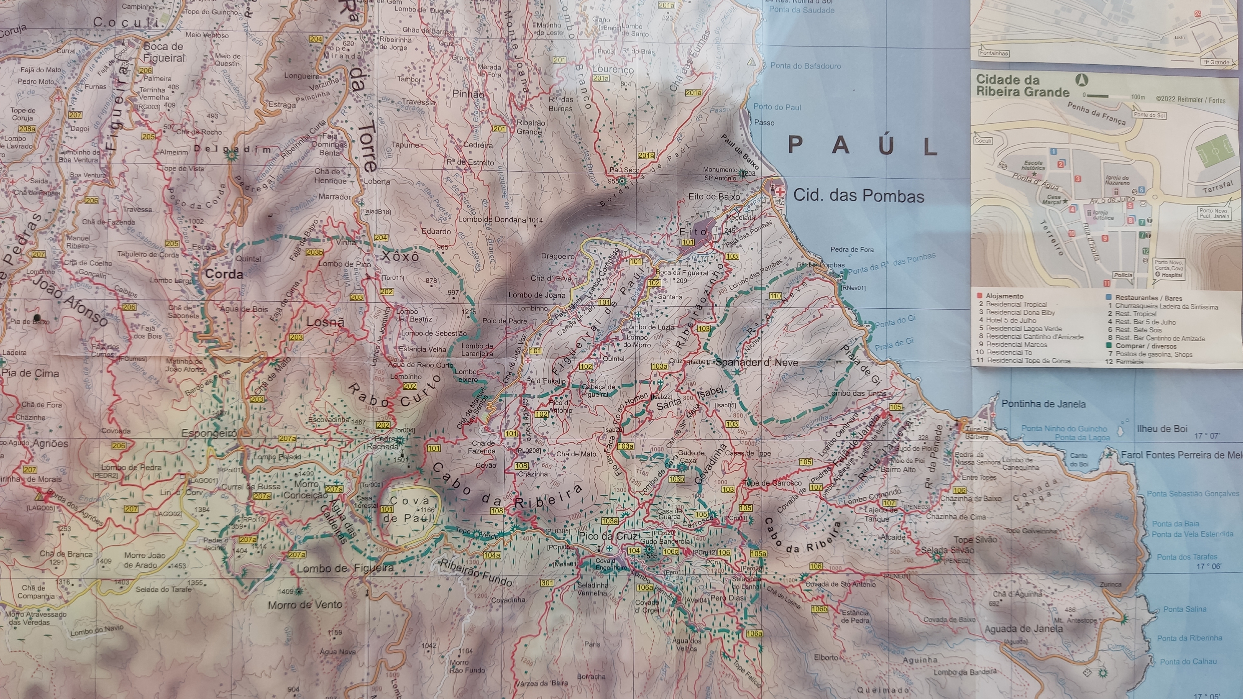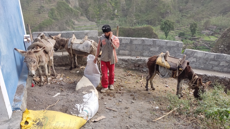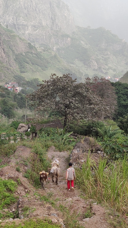 Caminata desde Cha de Padre a Paul (Pombas). Esta ruta puede hacerse en ambos sentidos, desde Paul es ascendente, desde Cha de Padre es descendente. En nuestro caso tomamos un aluguer hasta Cha de Padre (20 minutos, 200 escudos cada uno). El conductor nos deja al final del pueblo, entre dos carteles, uno señala la ascensión al Volcán de Cova, el otro es un sendero vecinal que lleva de vuelta hasta Paul. Lo seguimos durante unos 1000-1500 mts, cruzamos algunas casas y campos de cultivo, paralelos al cauce de un riachuelo.
