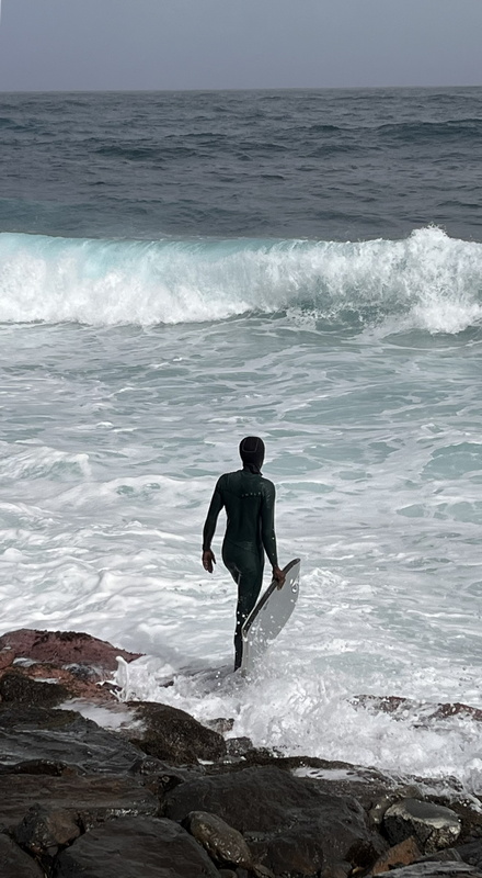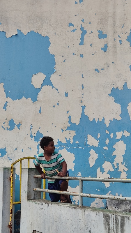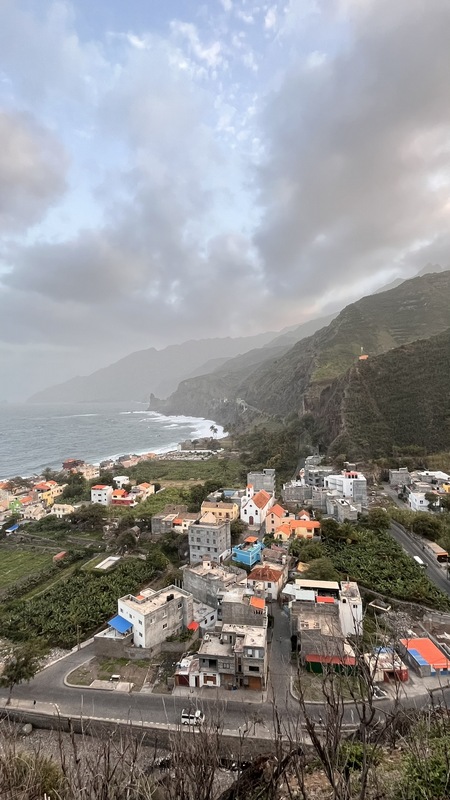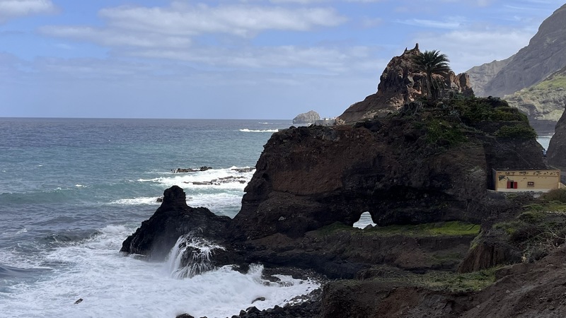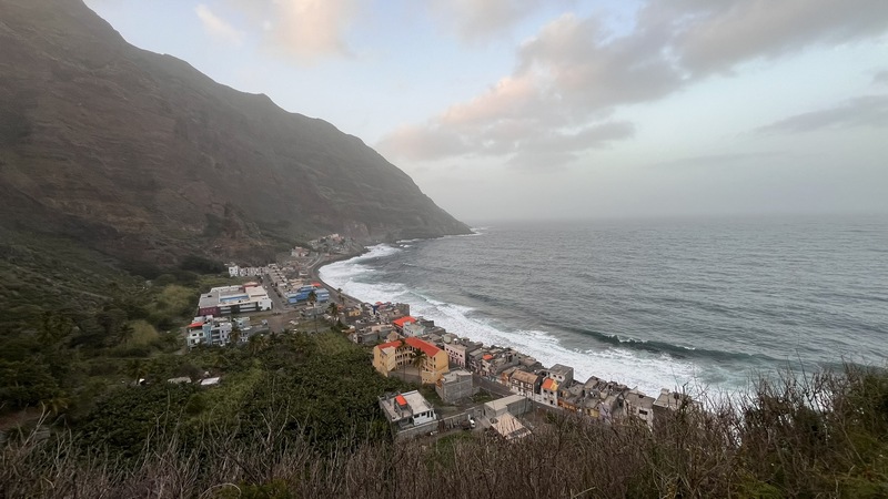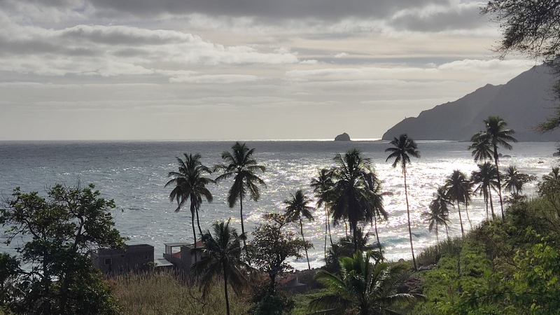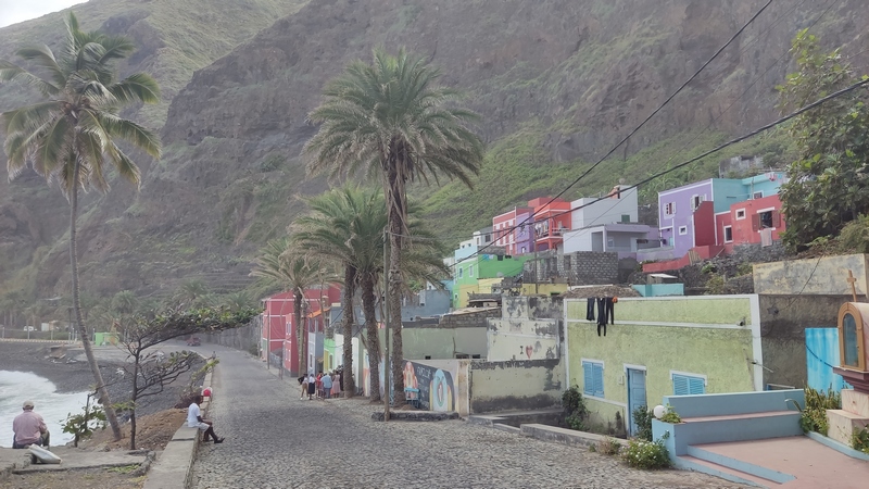Desembarcamos en Porto Novo, una población sin ningún interés turístico. En la propia terminal hay coches de alquiler, taxis, servicios de grupos organizados y aluguers. Tomamos uno a Paul, el trayecto dura poco menos de una hora y cuesta 350 escudos por persona. Paul (Pombas) es un pueblecito alargado, paralelo a la costa, con una docena de hoteles y restaurantes, y media docena de pequeñas tiendas de abastos. El ambiente es relajado, las vistas del mar son espectaculares, y aunque no es ideal para el baño, pues es bastanteo bravo y no hay playas, si que vimos algunos locales haciendo bodyboard surf. Merece la pena subir hasta lo alto de la colina donde se encuentra la estatua de San Antonio das Pombas, unos 200 escalones, y disfrutar de unas bonitas vistas del pueblo al atardecer.