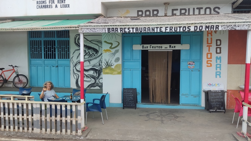 Laranjinha, primera línea de mar junto al puente. Excelente plato de caballa a la parrilla, tres cervezas y una bolsa de patatas fritas, 1.800 escudos. Dispone de una TV enorme donde ponen deportes, entre ellos la final de la Supercopa (la mayoría del público local era merengue).