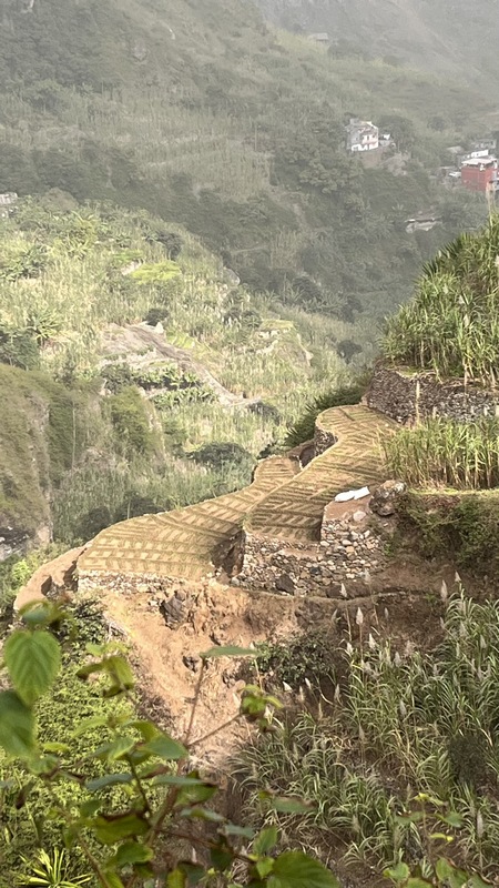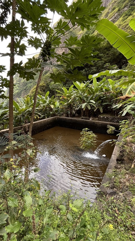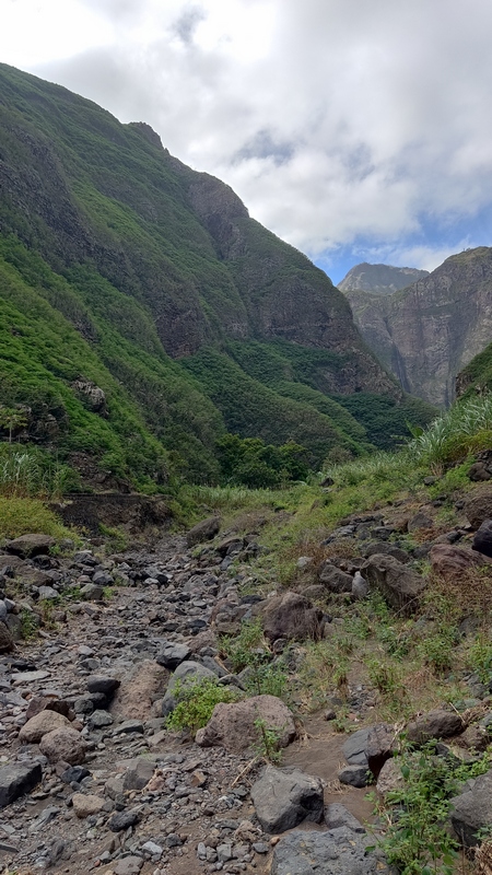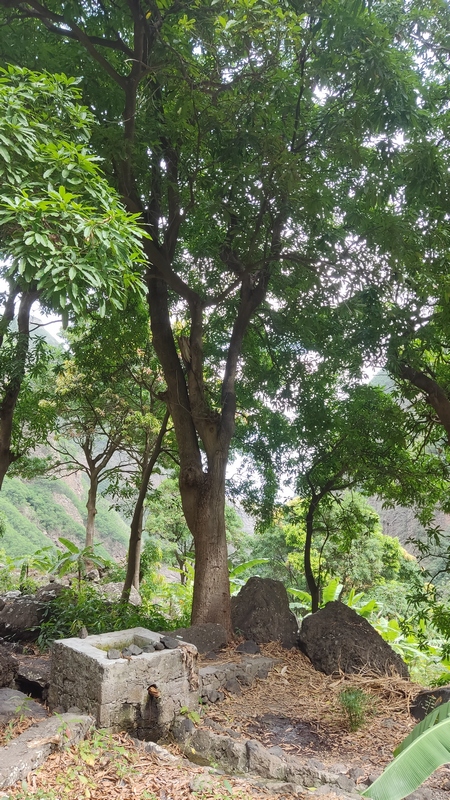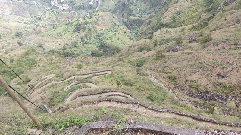 Desde aquí hay 1.300 mts de desnivel y unos 15 km de distancia hasta Paul. Empieza un empinado descenso por un estrecho y vertiginoso camino de tierra empedrado. Las vistas son espectaculares, curva tras curva el sinuoso sendero nos ofrece unas vistas espectaculares del valle y el mar al fondo. Tras una hora de descenso, aparecen un par de cabañas de agricultores locales donde venden agua, refrescos, te, café o fruta, y puedes parar a descansar un poco. El paisaje cambia, las estrechas terrazas de cultivo dan paso a amplias plantaciones de café, caña de azúcar, plataneros, mangos, aguacate... Una hora más y llegamos a