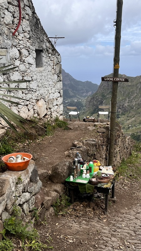 grogue de elaboración propia. Cachupa con huevo frito, selección de quesos y otros snacks, y dos zumos 1.700 escudos. El local es muy bonito, la comida normal, sobre valorado en los medios y guías de viaje. Cómo desde aquí la caminata hasta Paul ya la hicimos el otro día, cogemos el desvío de