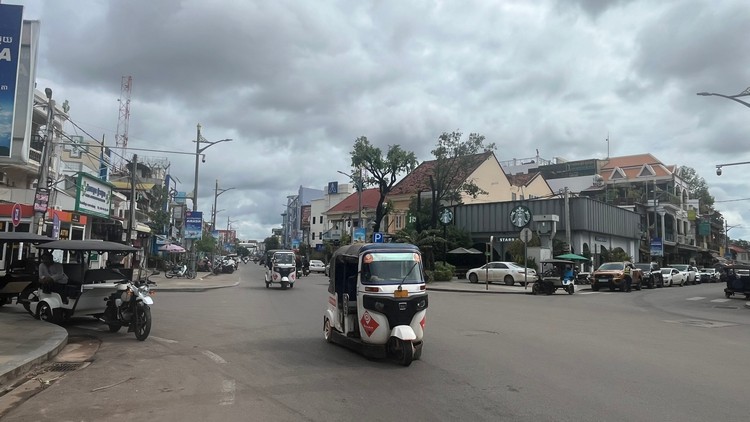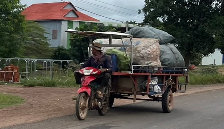 rickshaw (carro de dos ruedas tirado por una persona), muy usado en diferentes partes de Asia sobre todo como taxi. El conductor va sentado delante, frente al manillar, detrás pueden sentarse hasta tres personas (tamaño asiático). Para conducirlo en Camboya hace falta el carnet internacional, que desde el propio