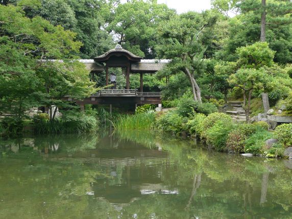 Jardín Shosei-en (500¥). Fue construido a finales del siglo IX, como parte de la mansión de Minamoto no Toru, hijo del emperador Saga. Hizo construir el lago imitando la costa de Shiogama, incluso dicen que se hizo traer agua de mar desde Namba para dar el toque final. En 1643, Sennyo Shonin, concibió un hermoso jardín que rodeara el lago. Tras varias restauraciones durante el periodo Meiji, hoy encontramos casas de té, árboles centenarios, cascadas de agua, el lago lleno de carpas surcado por un bonito puente de madera, y un magnífico muro de piedra que rodea todo el conjunto. Dicen que lo mejor es verlo en primavera cuando esta todo floreado, de hecho incluso proporcionan una guía de flores al entrar.
