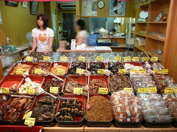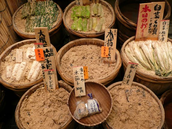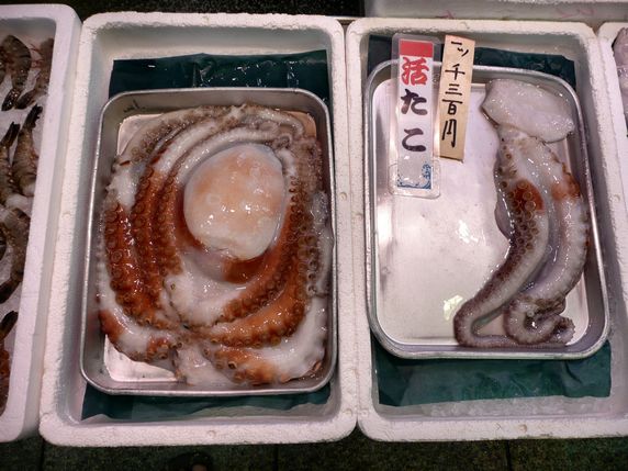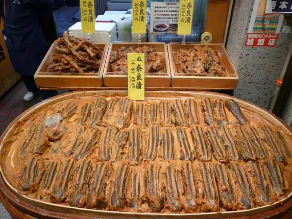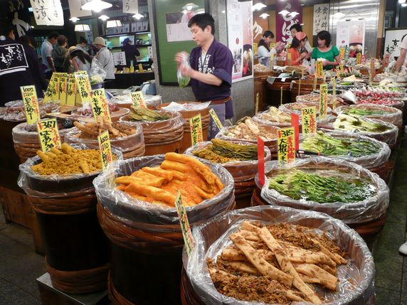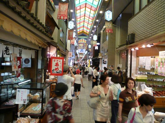 Nishiki Food Market. Es una larga calle cubierta, paralela a Shijo Av., flanqueada por variados puestos de comida. Pescado fresco y procesado, frutas, hortalizas, verduras, algas, encurtidos, escabeches, dulces típicos japoneses, sushi, marisco, te, instrumentos de cocina... todo lo necesario para la cocina diaria. No es tan animado como el de Kanazawa y hay muchísimo mas turismo, pero no deja de ser un lugar curioso y muy recomendable para visitar en Kyoto.