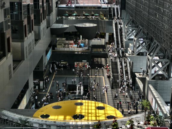 Kyoto Station. Fue construida con motivo del 1.200 aniversario de la fundación de Kyoto. Tiene el segundo edificio mas grande de Japón construido sobre una estación de tren, el primero esta en Nagoya. En su interior hay tiendas, restaurantes, un centro recreativo, un hotel, un teatro, oficinas gubernamentales, y unos grandes almacenes Isetan. Atravesando la sección de kimonos se llega al Tourist Information Center. En la azotea de la 15ª planta se tienen unas buenas vistas de la ciudad.