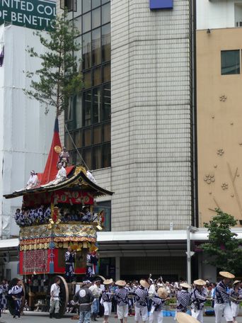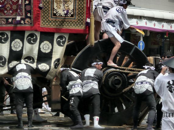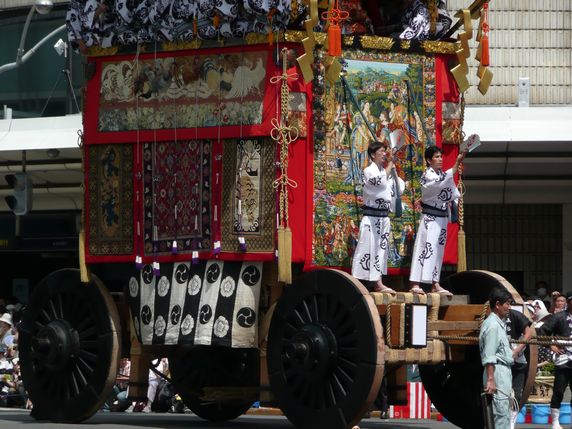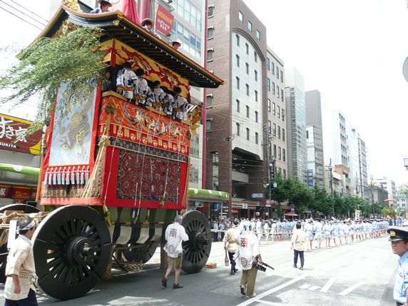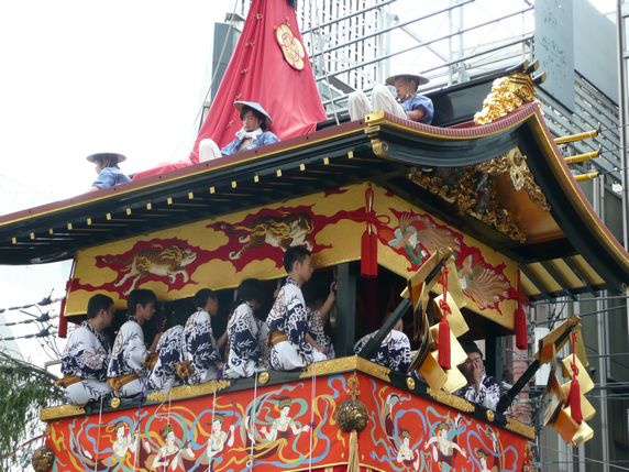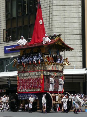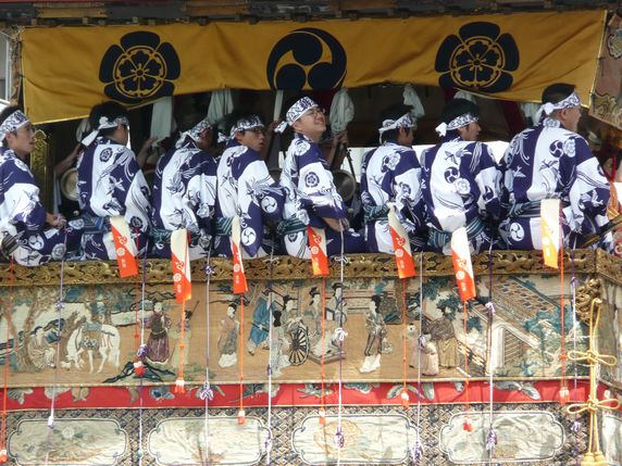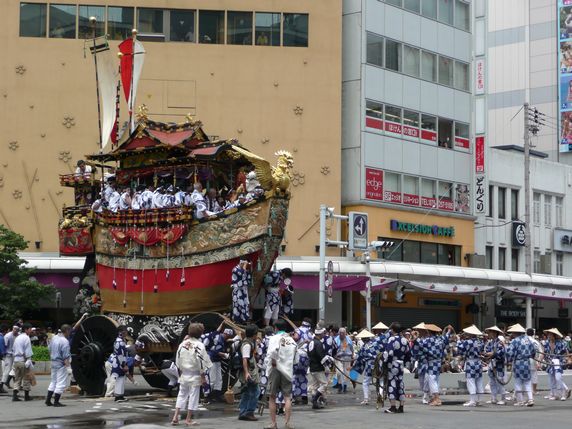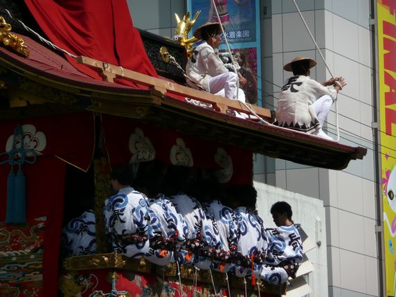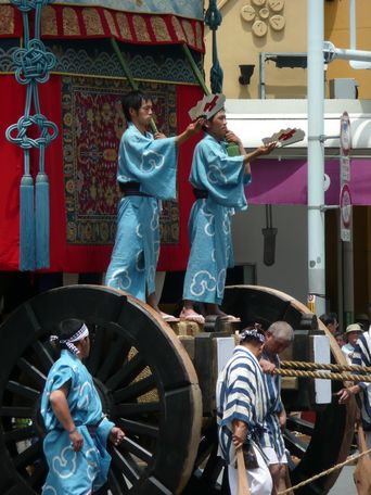 hoko) son tiradas con cuerdas por unas 50 personas, llegan a pesar 15 toneladas y alcanzan 25 metros de altura. En los cruces ponen en el suelo cañas de bambú bajo las ruedas delanteras, engarzan las ruedas con cuerdas y desde el extremo contrario tiran de ellas mientras otros empujan la rueda. Un giro de 90º requiere tres empujes al menos, que llevan unos diez minutos. Cada empujón es coreado por gritos de ánimo y admiración del numeroso público que abarrota las calles. Son estructuras de dos plantas. Un par de personas en el tejado mantienen el paso limpio de cables eléctricos, la segunda planta la ocupan una veintena de músicos campanilleros, y al frente un par se encargan de dar las ordenes a los arrastreros. Ambas