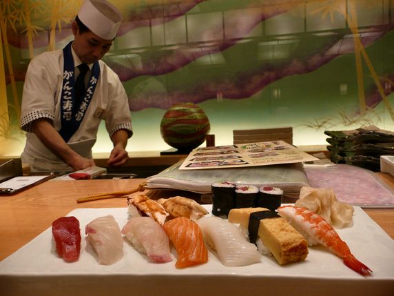 Ganko Takasegawa Nijoen. Local agradable, servicio atento vestido al estilo tradicional. Comemos sentados en la barra, delante del cocinero que preparará nuestros platos. Combinado de siete piezas de sushi, tres makis, un poco de tempura y una sopa de miso, además pedimos ensalada, cerveza y un cuarto de melón (hay que aprovechar los pocos sitios donde hay fruta) 3.181¥.