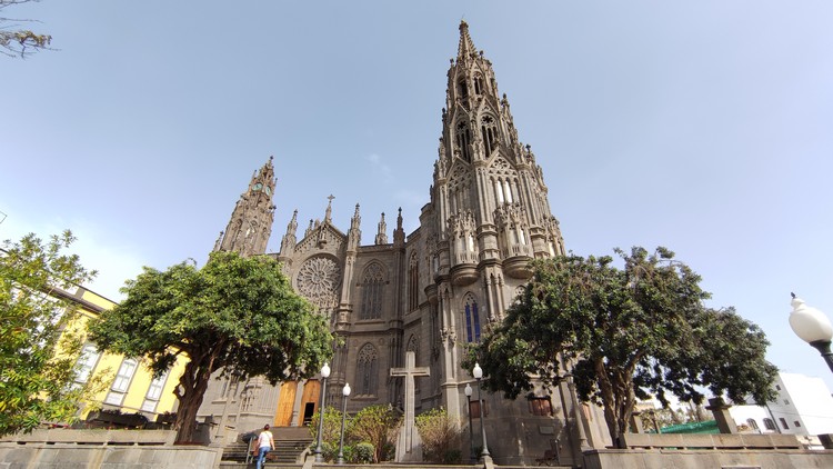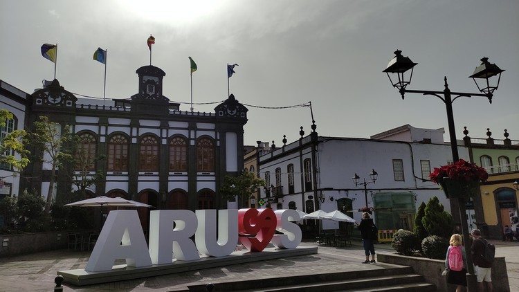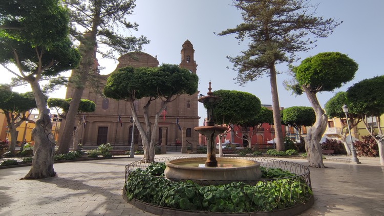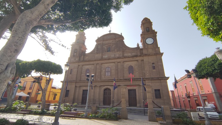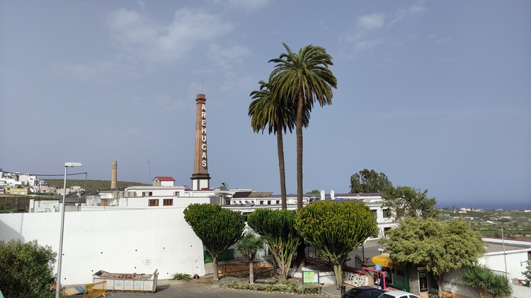 Arucas. En su pequeño centro histórico peatonal, desayunamos unos bocadillos de lomo (embuchado) con queso y alioli, otro de tortilla de patatas con plátano macho. Paseamos un poco por el pueblo, sin duda lo mas llamativo es su Iglesia Parroquial, con una majestuosa torre campanario de 60 mts de altura. También pueden visitarse varias casas tradicionales. como el antiguo ayuntamiento y el mercado, el parque municipal, la Casa de la Heredad de Aguas, o la Fabrica de ron Arehucas, fácilmente reconocible por su alta chimenea con el nombre escrito.
