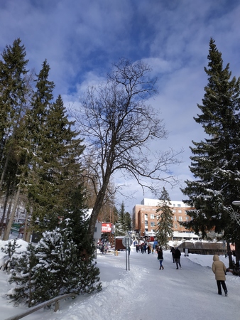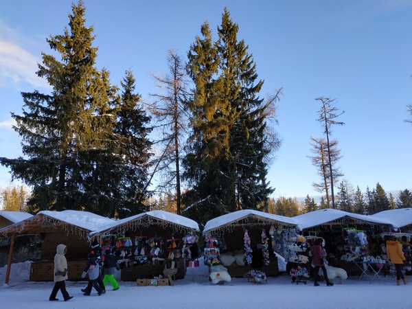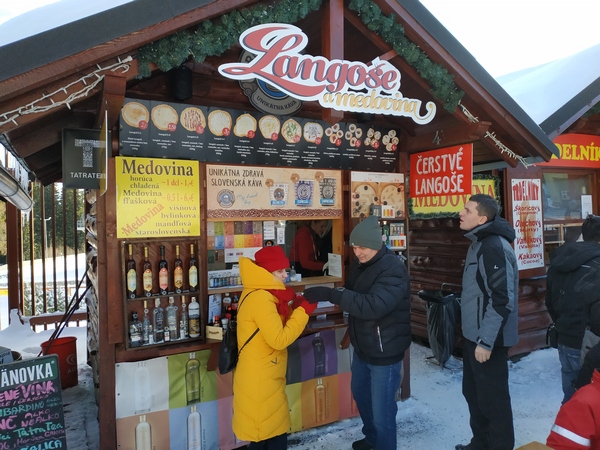 En el Sports Center hay alguna tienda de ropa y material de esquí, además de un área de restauración con una veintena de cabañas donde venden comida y bebida para llevar, que se puede tomar en unas mesas al aire libre. Comemos langose, masa de pan frito cubierta con queso, parecido a una pizza margarita. Pero solo con eso no calientas el cuerpo a -10º, y menos aún si comes al fresco, compramos unas castañas a la brasa para calentar las manos, y un licor local para calentar el resto del cuerpo.