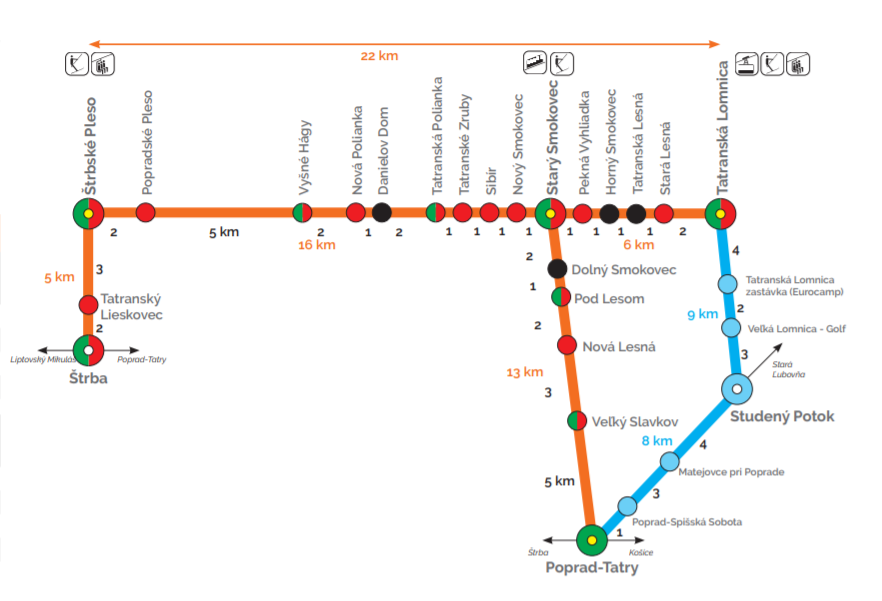 Tatra Railway, un ferrocarril electrificado de vía estrecha única que une las poblaciones de Štrbské Pleso y Tatrnaská Lomnica. Son un total de 15 estaciones para cubrir una distancia de 23 km, con paradas en pueblos, teleféricos y pistas de esquí.