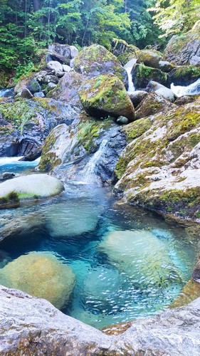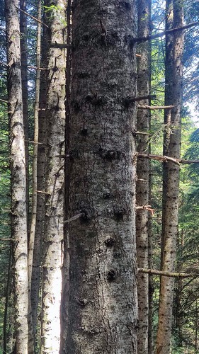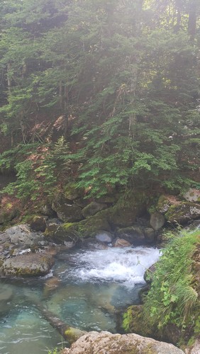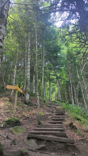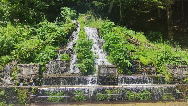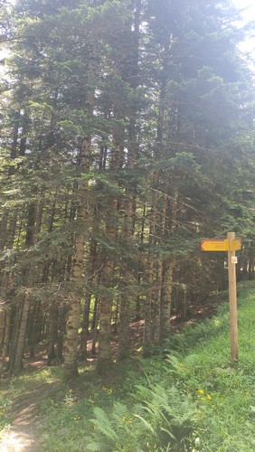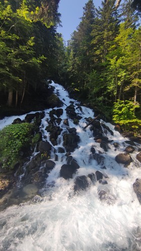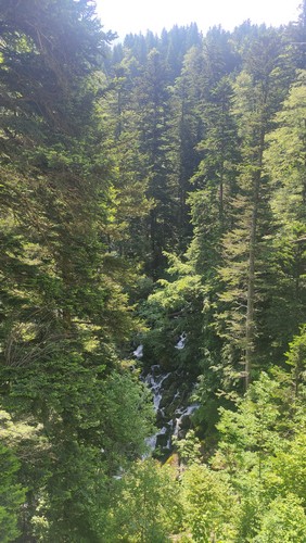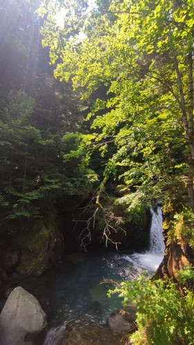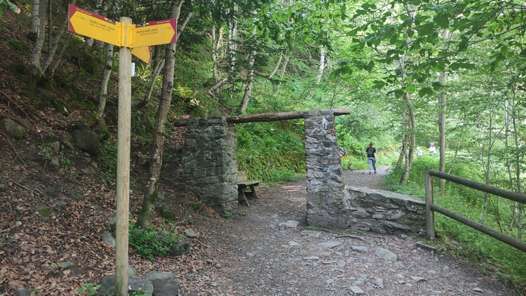 Uelhs deth Joeu. Por un camino ancho se llega al espectacular salto de agua de los Uelhs deth Joeu. Se atraviesa el puente metálico y se asciende por una senda con escalones de tronco en medio del bosque de abeto y haya que gana altura rápidamente, pasando luego a convertirse en un camino más definido. Una vez pasado el portal de piedra que da entrada al