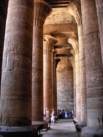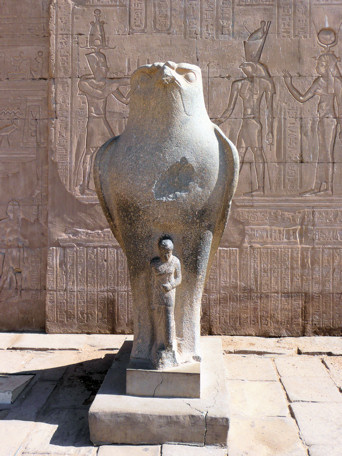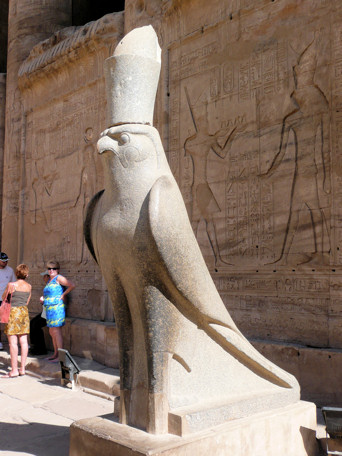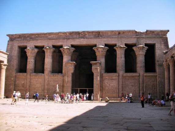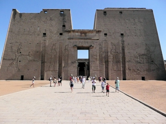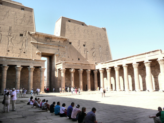 Templo de Edfu. Dedicado a Horus, es el templo mejor conservado de Egipto y uno de los más grandes. Tras el colosal pilón de entrada vigilado por dos halcones de granito, se accede la atrio, cuyas paredes están llenas de relieves que cuentan su construcción por parte de Tolomeo III, padre de Cleopatra, y las luchas de Horus con su tío Set para vengar el asesinato de su padre Osiris. En el santuario a Horus, al final del complejo tras la sala hipóstila, hay una reproducción en madera de la barca divina utilizada antiguamente para las procesiones.