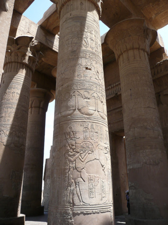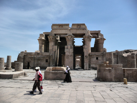 Templo de Kom-Ombo. Es el único templo construido en un doble plano. Todo esta duplicado. Tiene santuarios gemelos para el dios cocodrilo Sobek y el dios halcón Horus, hay dos entradas, dos santuarios, dos patios, dos salas hipóstilas... Es mucho más pequeño que el anterior y se encuentra en peor estado de conservación, pero su ubicación en una de las curvas del Nilo lo convierte en uno de los templos más atractivos de visitar. A los lados de la entrada hay un nilómetro y un museo con tres cocodrilos modificados, que desafortunadamente no vimos.
