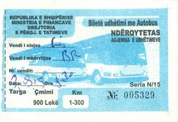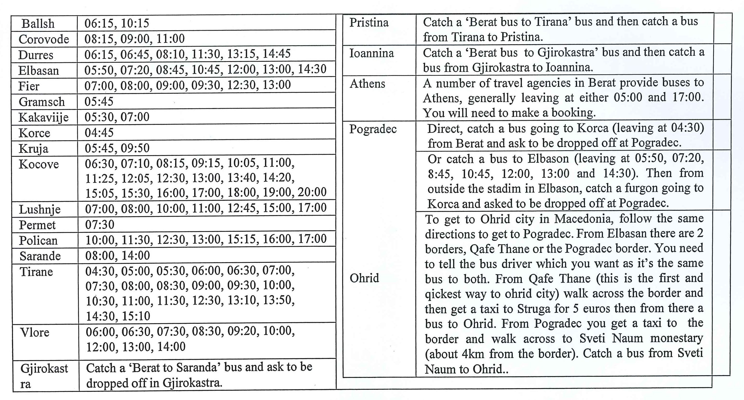 800 lek) que, procedentes de Sarandë, paran en la gasolinera del cruce principal a las 09:30 y 16:30. Van hasta los topes, solo queda un taburete de plástico sin respaldo en el pasillo, aunque tengo mejor suerte que los que suben detrás mío que irán de pie. En caso de no poder subir se pueden coger los autobuses con destino final Nisja que salen a las 10:00 y 17:00, bajar en Feis, y allí coger una furgoneta hasta Berat. Una vez en Berat coger el autobús urbano (