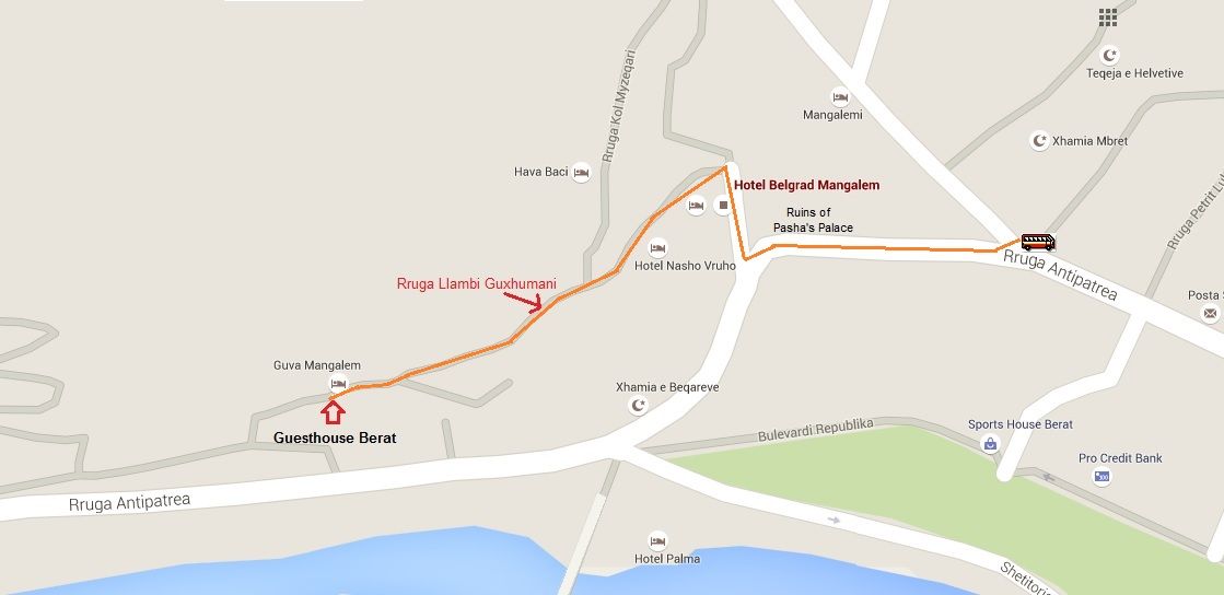 estación de autobús, de la que parten la mayoría de los autobuses nacionales y furgonetas locales, toma el autobús blanco que para frente al Puente de Piedra en el lado de Mangalem. Pasan cada 15 minutos, cuestan 30 lek y tardan unos 15-20 minutos hasta la estación.