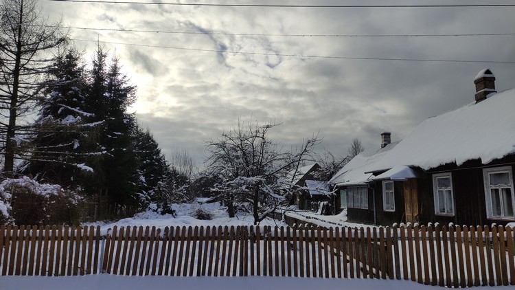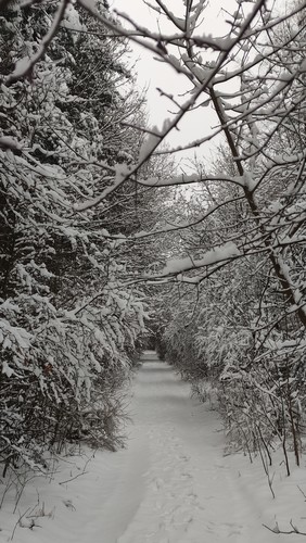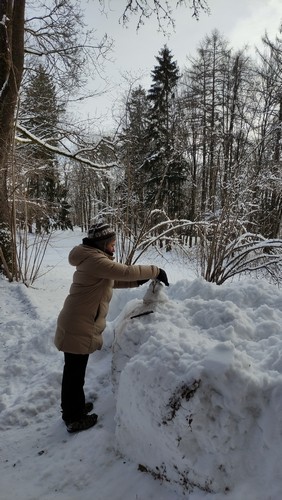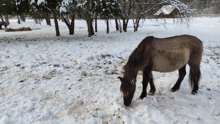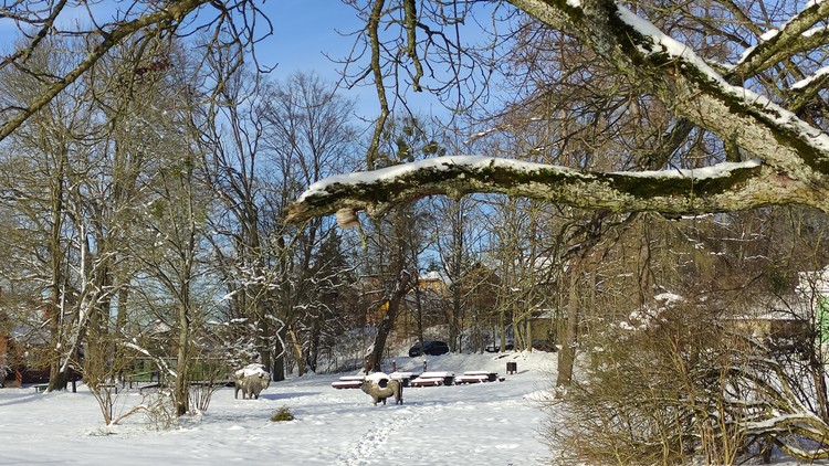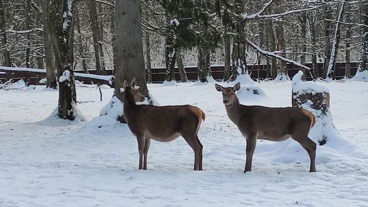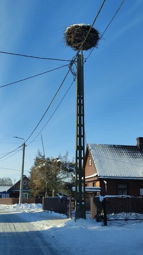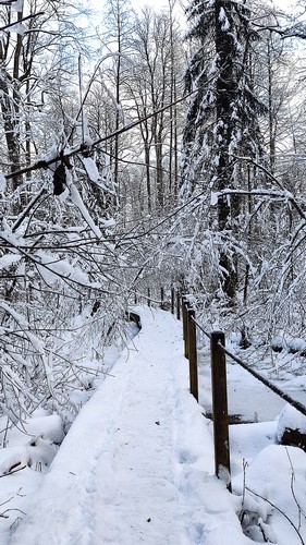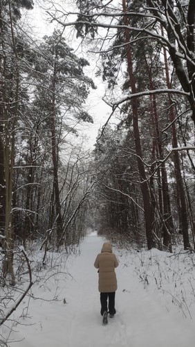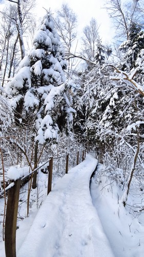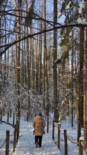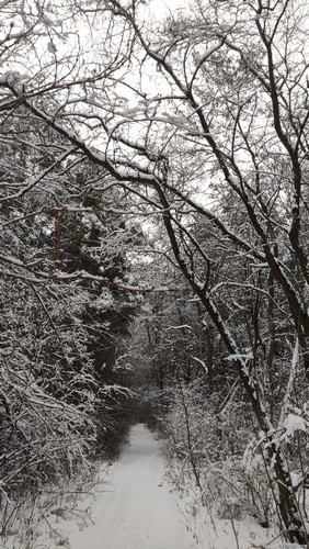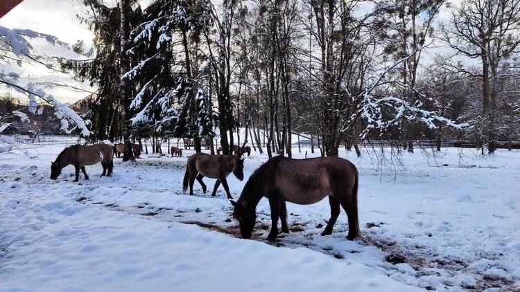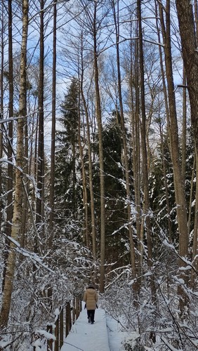El paisaje está completamente cubierto de nieve, altísimos arboles nos acompañan todo el camino, algunas ramas cubiertas de nieve están medio caídas bloqueando el paso, se oyen finas corrientes de agua que discurren bajo el suelo helado... una maravilla. El camino acaba en una mini reserva de animales autóctonos (acceso 20 PLN). Aunque hay una ruta circular hasta Bialowieza, la mayoría discurre por carretera, decidimos volver por el mismo camino que hemos venido. Para cenar repetimos en