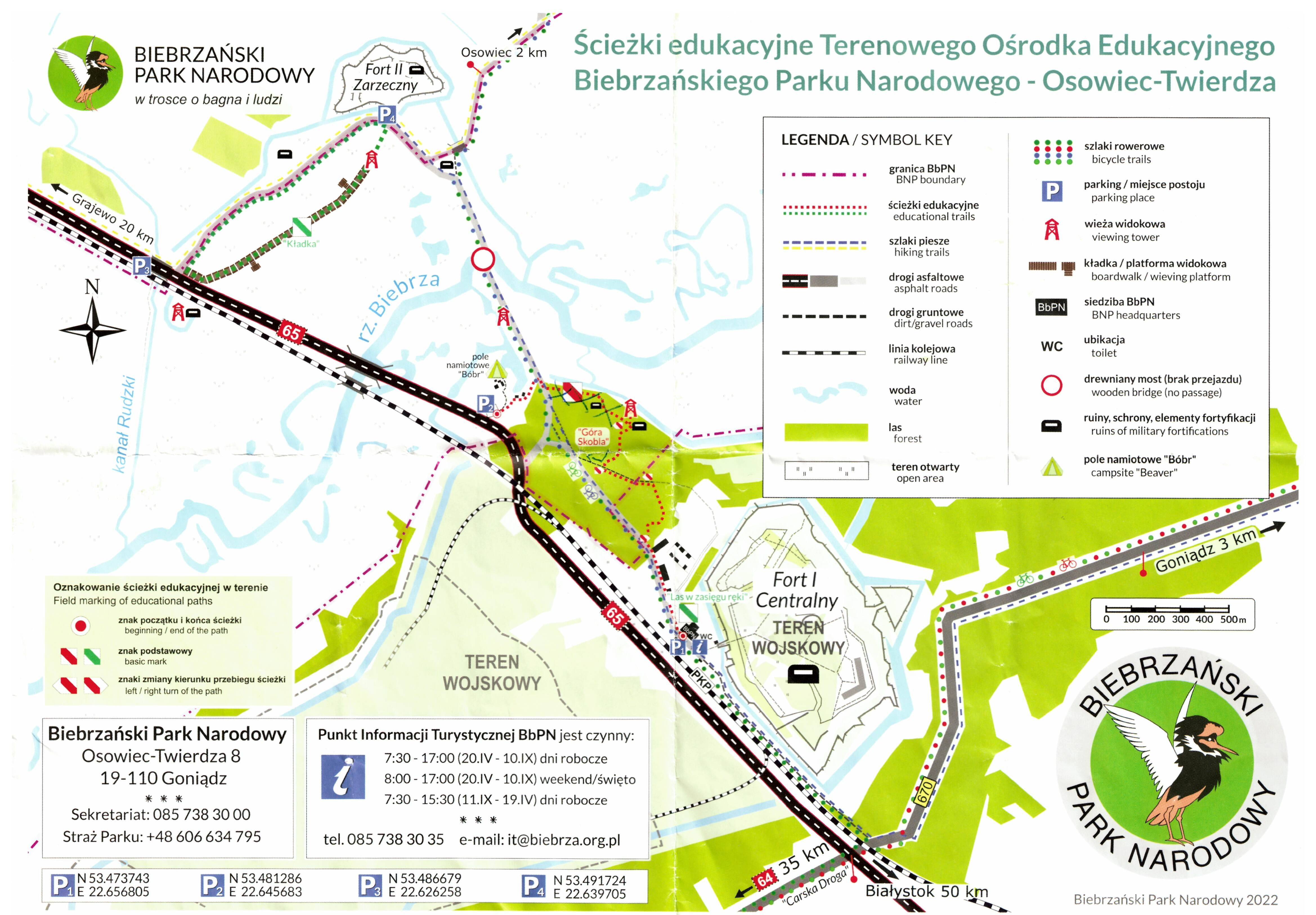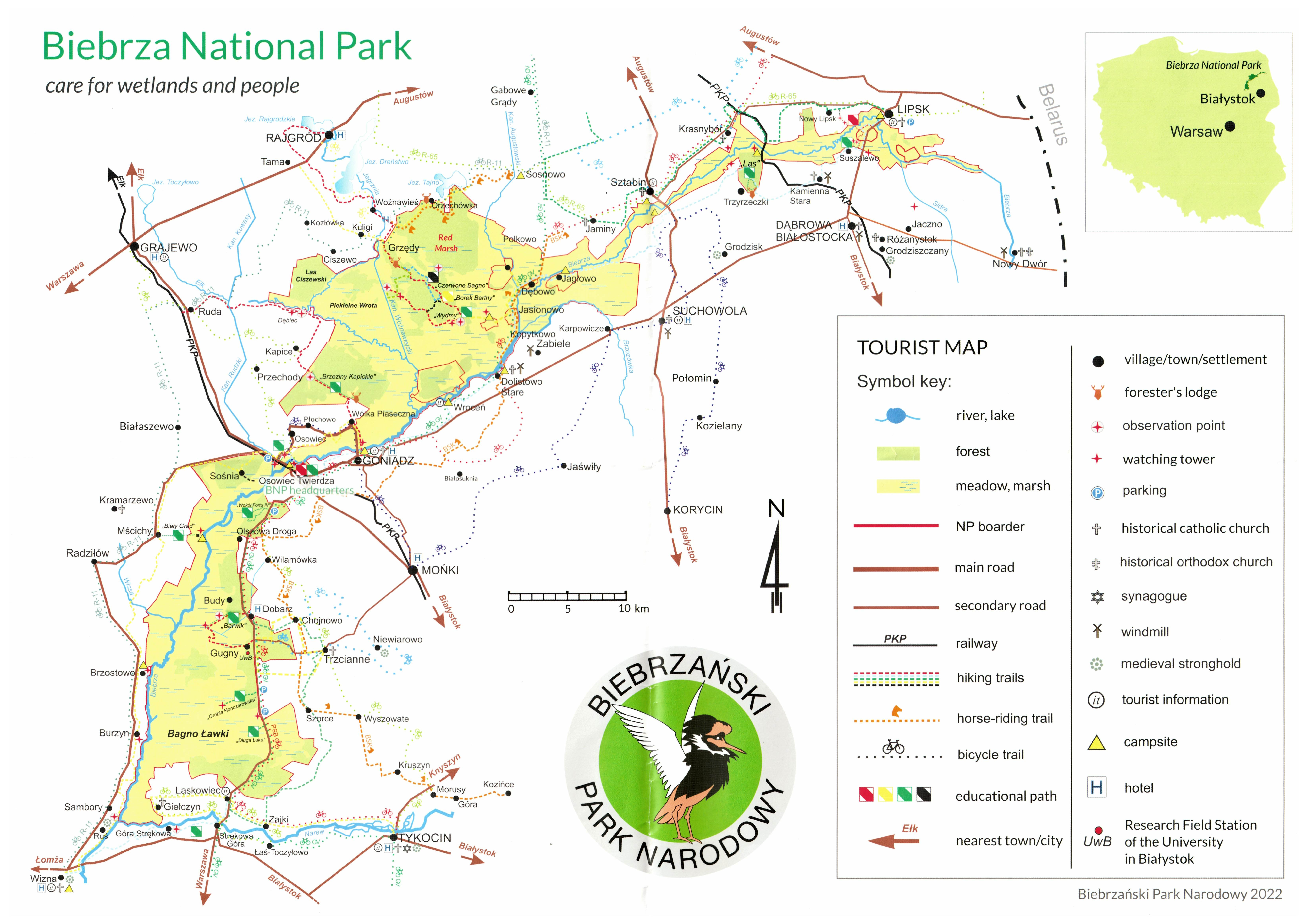 Biebrzański Park Narodowy), que protege una amplia área de bosques y marismas junto al río Biebrza. Es una importante zona para la reproducción, alimentación y descanso de aves. También habitan mamíferos como alces, castores y lobos. El Centro de Visitantes, que se encuentra en Osowiec-Twierdza (