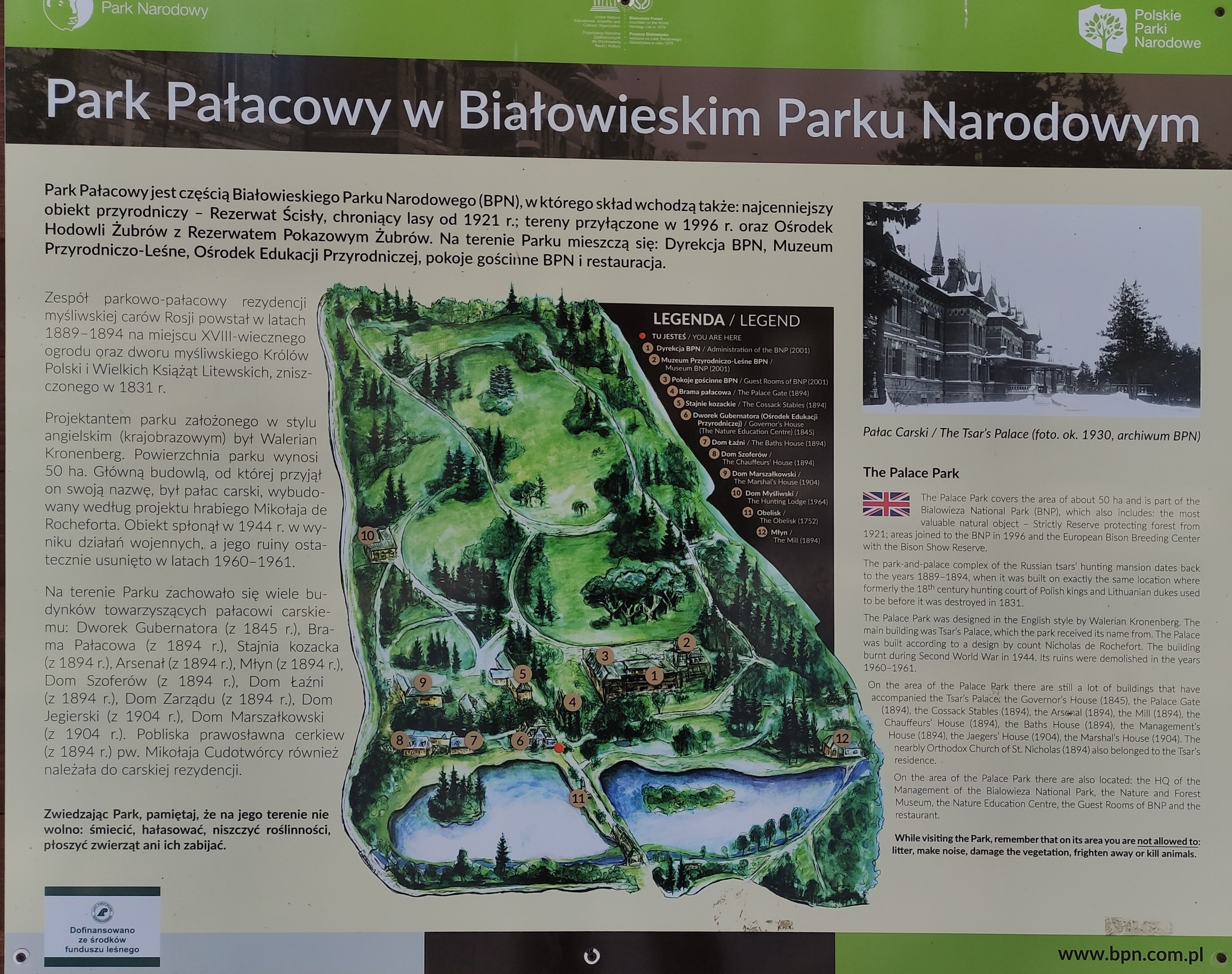 Parque de Palacio, en el centro de Bialowieza. Fue fundado a finales del siglo XIX, alrededor del palacio de caza de los zares de Rusia erigido entre 1889 y 1894. El palacio se quemó por completo en 1944, aunque han sobrevivido algunos edificios auxiliares. Hoy en día, cuenta con alrededor de 90 especies de árboles y arbustos europeos, americanos y asiáticos que crecen alrededor de dos pintorescos estanques.