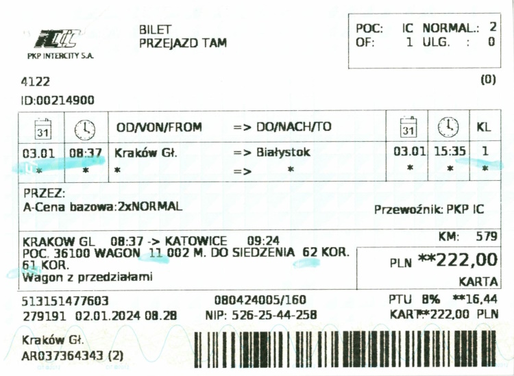 Bialystok, donde tenemos intención de alquilar un coche en la propia estación. Salimos desde Krakow Glowny, una hora hasta Katowice, cambiamos de trenes, y cinco horas y media hasta Bialystok. Como solo hay 10€ de diferencia viajamos en primera clase. Los asientos son muy cómodos, el espacio amplio, el tren dispone de vagón restaurante y todo está muy limpio. Realmente un servicio muy bueno. Precios y reservas en