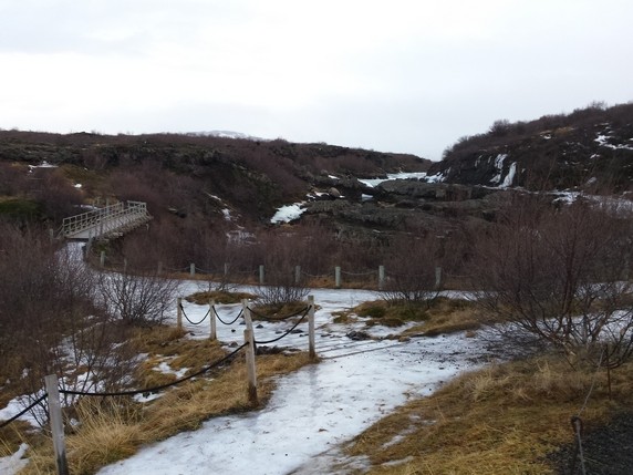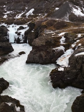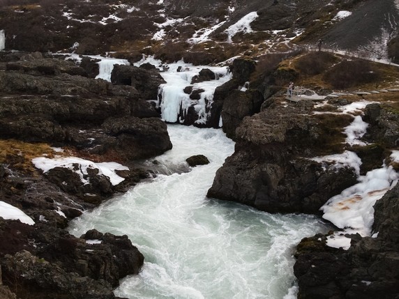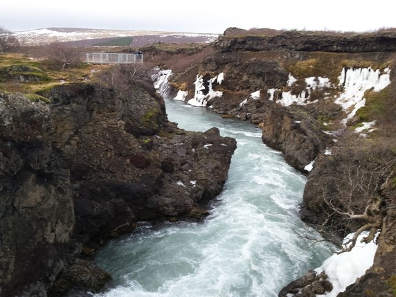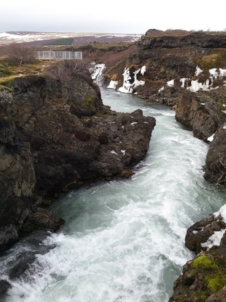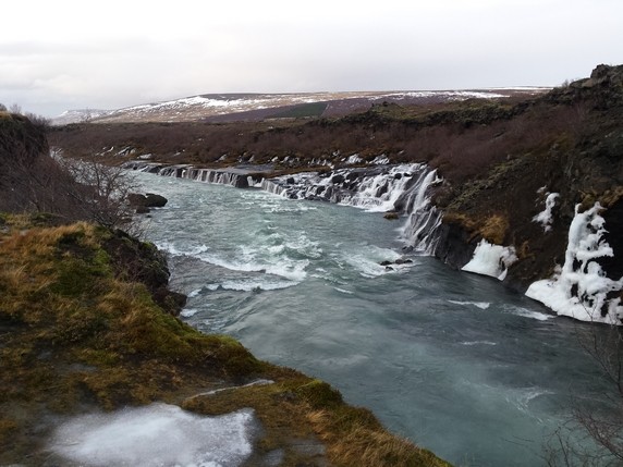 Hraunfossar, formada por una sucesión de pequeños riachuelos que surgen directamente de un campo de lava, y descargan sus aguas sobre el río Hvita a lo largo de 900 mts, creando una impresionante serie de cascadas. Hay varias pasarelas y puntos de observación frente a las cascadas, pero desafortunadamente están congelados y no llevamos crampones. Así que campo a través, buscando zonas de hierba donde el hielo no haya cuaje, a paso lento e inseguro, tenemos visiones parciales de esta maravilla.