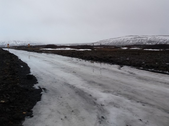 Cuando salimos del hotel llueve y hace muchísimo viento. Son las nueve de la mañana y aún es noche cerrada, aquí amanece a las once, aunque puede que no te des cuenta pues no sale el sol. Cogemos la carretera 41 hasta Keflavik, está en buen estado, bien asfaltada y bien señalizada. Recorremos una extensa llanura donde se suceden los pequeños pueblos y granjas a un lado y el mar a otro. Al norte de la capital el paisaje cambia por completo, las montañas en el horizonte están completamente nevadas, empieza a aparecer nieve en los márgenes, el asfalto está permanentemente húmedo, y la carretera ya pasa a ser de un carril sin apenas arcén. Siguiendo la