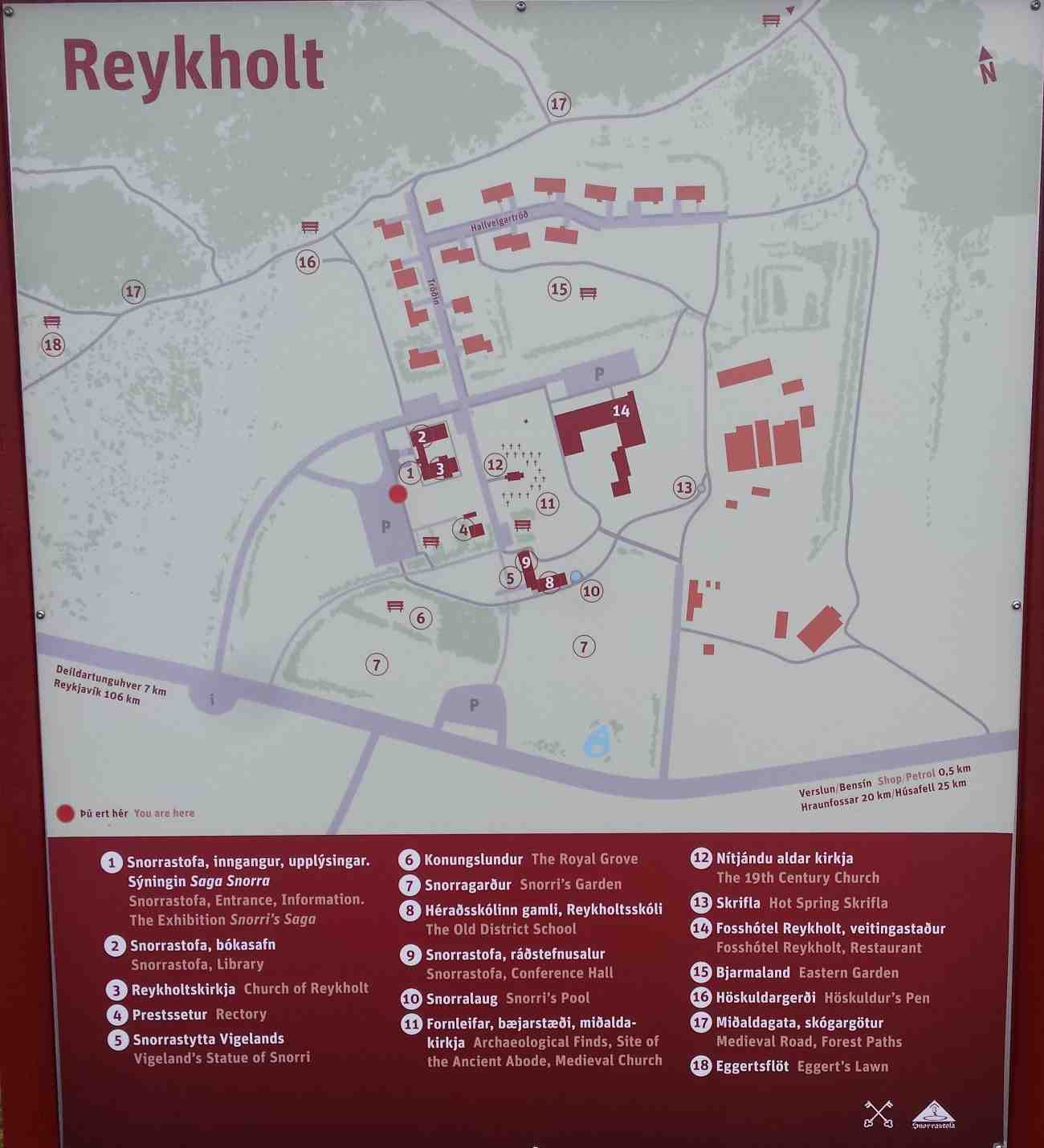Reykholt, que fue durante la edad media uno de los centros intelectuales y religiosos del país. Snorri Sturluson, un importante historiador y político del siglo XIII vivió aquí durante 35 años. Los atractivos del pueblo, que hoy cuenta con menos de 60 habitantes, giran en torno a él. Se conserva parte de su granja y una poza de piedra con agua caliente que data del siglo X. El agua llega hasta aquí por un pequeño túnel desde Snorralaug, un manantial de aguas termales situado a 300 mts, actualmente cubierto por un muro de piedra y una chimenea humeante. La zona es conocida por su actividad geotermal, de hecho hay varias piscinas de agua caliente abiertas al público en la zona, y por las calles del pueblo pueden verse pequeños surtidores de agua burbujeante. También se puede visitar