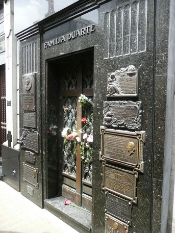 Cementerio de la Recoleta. Es un camposanto pequeño, no habrá mas de 2.000 lapidas, pero además de po seer una colección de mausoleos impresionante, uno tras otro, pasillo tras pasillo, a cual más ostentoso, en él están enterradas algunas de las personalidades mas importantes de la historia argentina. Aquí reposan al menos una docena de presidentes (Raúl Alfonsín, Hipólito Yrigoyen), militares (Almirante Brown, Facundo Quiroga), artistas (Adolfo Bioy Casares), premios Nobel como Luis Federico Leloir, y por supuesto el personaje mas famoso de Argentina, el mausoleo mas buscado, el de la Familia Duarte, donde descansa Eva Perón. Mas allá de su interés histórico no me pareció una visita interesante para extranjeros.