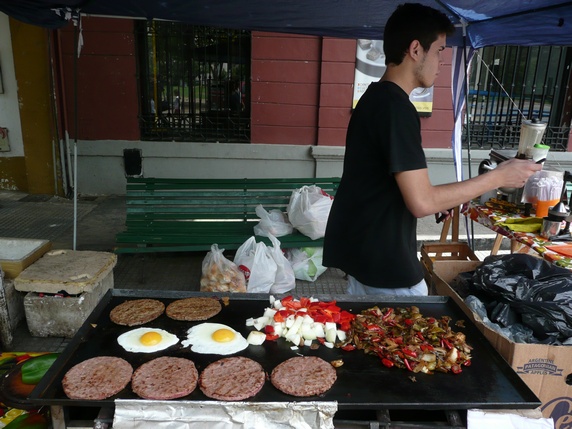 Antes de entrar comemos un par de hamburguesas y una coca cola en un puesto callejero (75 AR$), y hacemos un te y un