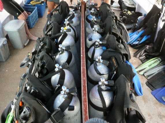 divemaster montará la equipación de sus "protegidos". Junto a estas hay dos garrafas de 15 litros de agua potable, un par de termos de agua caliente, té, café, galletas, pistachos, plátanos... Hay además un bidón de 50 lts de agua dulce donde remojar cámaras y mascaras. Todo el barco esta protegido del sol por un tupido toldo, y en el techo hay una zona semi cubierta con colchonetas donde relajarse y tomar el sol durante la travesía. La comida, en cantidad suficiente, es a base de platos locales de arroz, tofu, pollo, verduras, fideos, gambas y fruta.