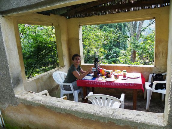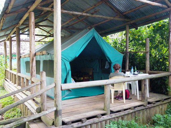 Buhoma View Bandas. 50.000shs / 90.000shs sin/con baño y ducha. Desayuno 5.000 shs. Tortilla o huevos revueltos, tostadas, fruta, mermelada, te, café muy bien. La habitación barata es una tienda de campaña con cama doble, dos sofás, y una terracita con una mesa y dos sillas de plástico, con vistas al Bosque Impenetrable de Bwindi. Baño compartido limpio y con agua caliente. Electricidad mediante generador de 19 a 22:30, pueden cargarse las baterías en recepción. Tranquilo, cómodo, espacioso, en medio de un entrono natural paradisiaco, y con un servicio atento y colaborador. Además se encuentra a 30 metros del punto de reunión para iniciar el