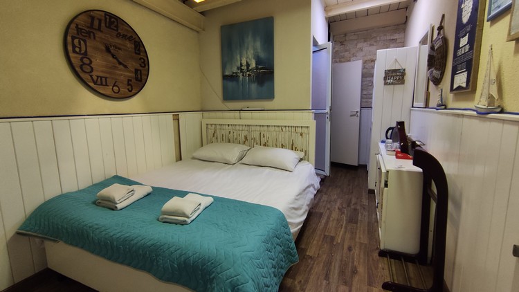 chill out de uso privado. Habitación de cama doble con baño y ducha, pequeña pero suficiente. Tetera y croissants. Dispone de restaurante con espectaculares vistas del puerto y una pizzería. No hace desayunos.