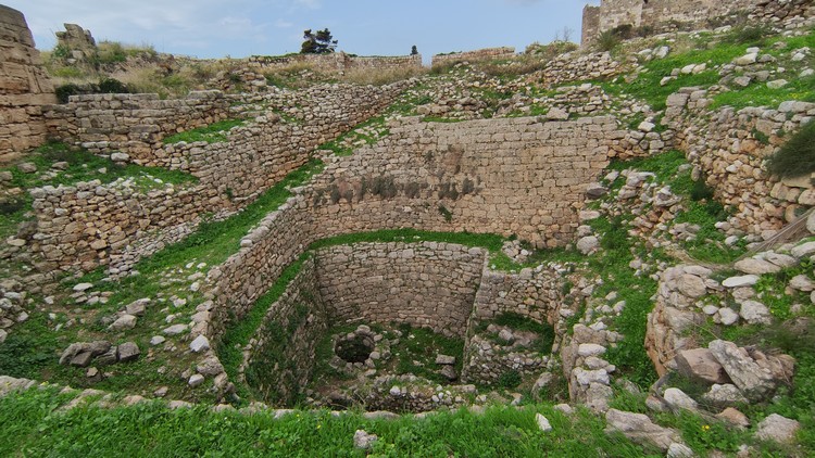 Dentro del recinto, ademas del pequeño castillo (unos 50 x 50 mts) cuyo interior está en un pobre estado de conservación, hay restos de la muralla fenicia, templos romanos del siglo III y IV aC, un pozo de la época helenística, un teatro romano con maravillosas vistas al mar, y un grupo de catacumbas reales del siglo II aC. El