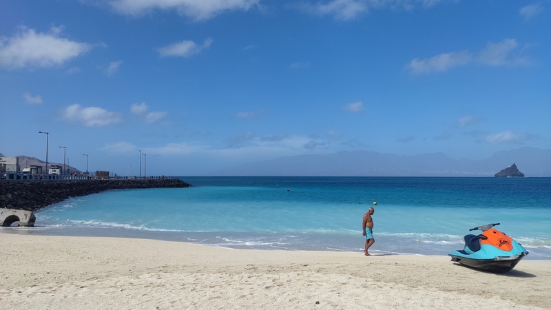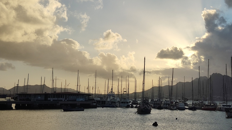 Cabo Verde Airlines que nos costó unos 80€. Existe también la opción de venir en ferry, pero solo hay un par o tres por semana, y además el viaje dura unas diez horas. Por otro lado, en invierno, durante los meses de diciembre, enero y febrero, los vientos son bastante fuertes en todo el archipiélago, y en ocasiones el mar está más bravo de la cuenta y el servicio de ferries queda suspendido, así que para asegurar el tiro optamos por el avión. Taxi desde el aeropuerto al centro de Mindelo, 12.000 escudos, tarifa oficial.