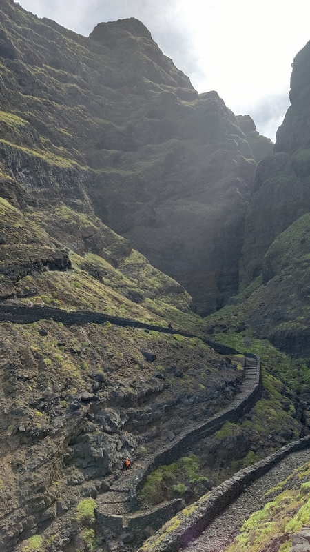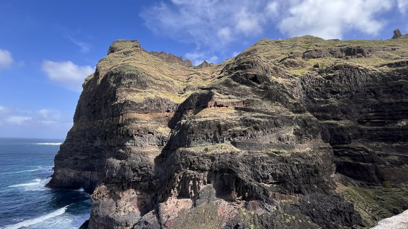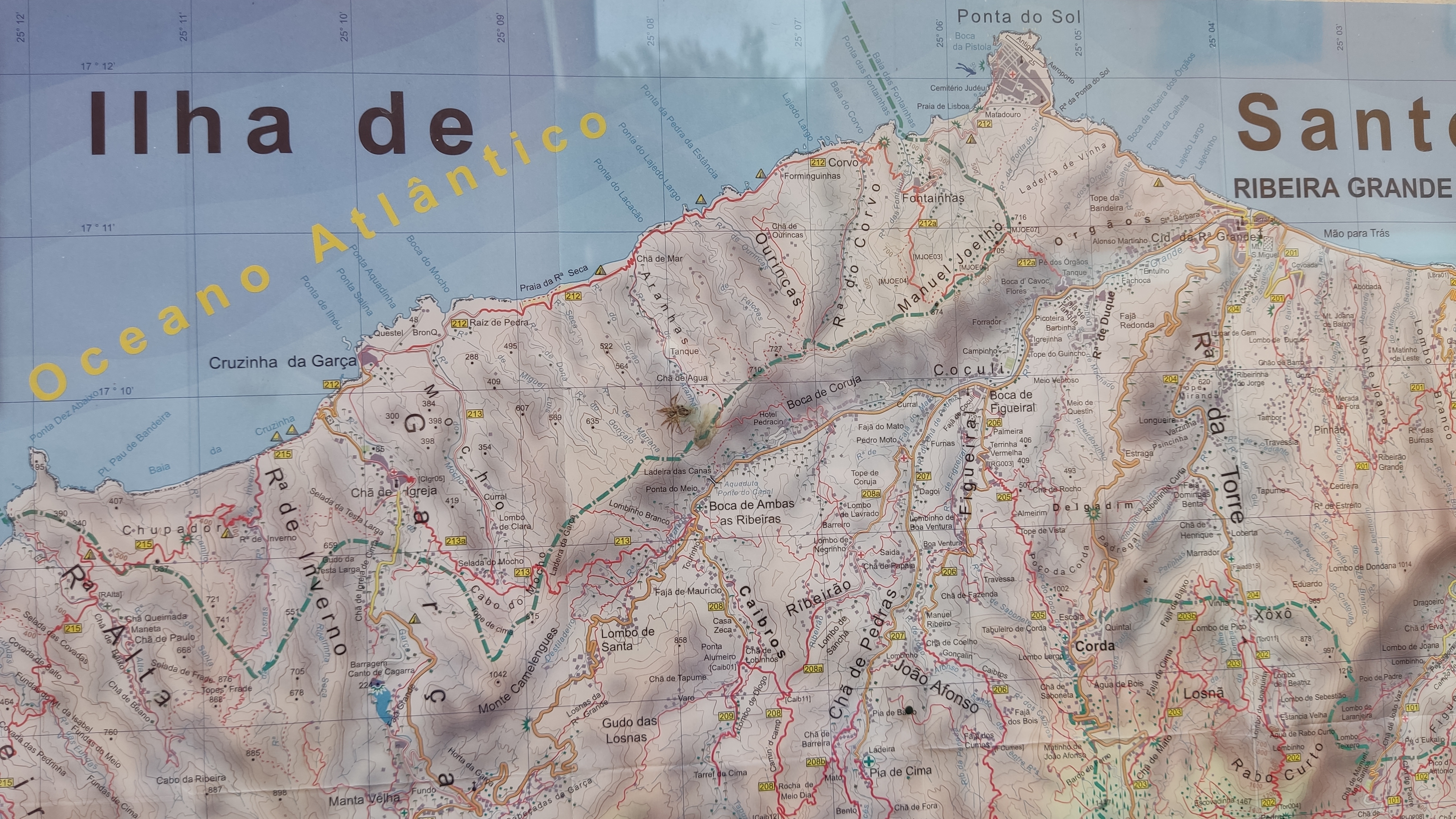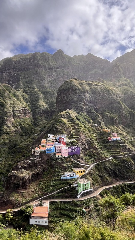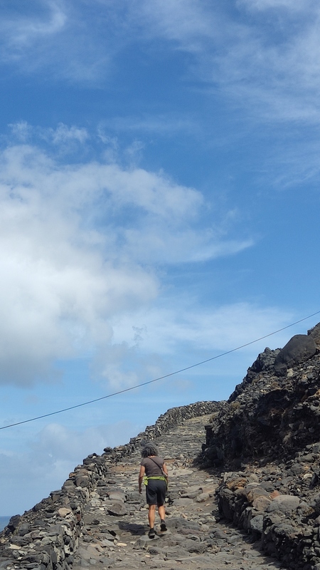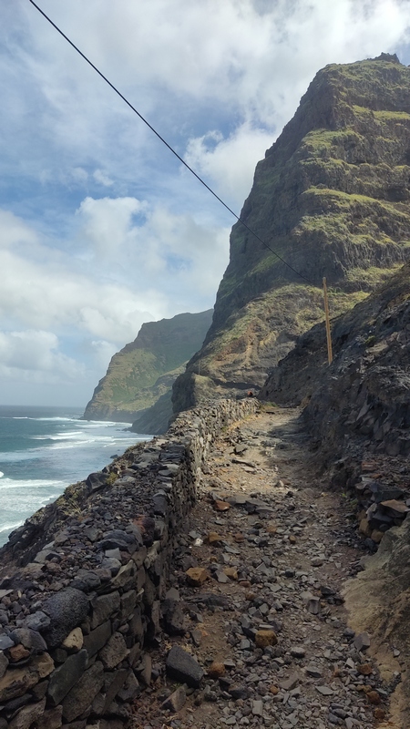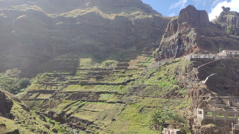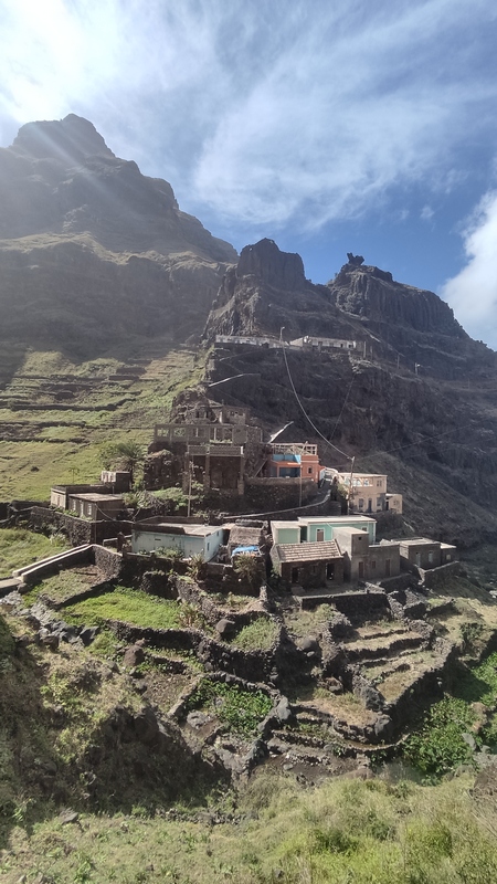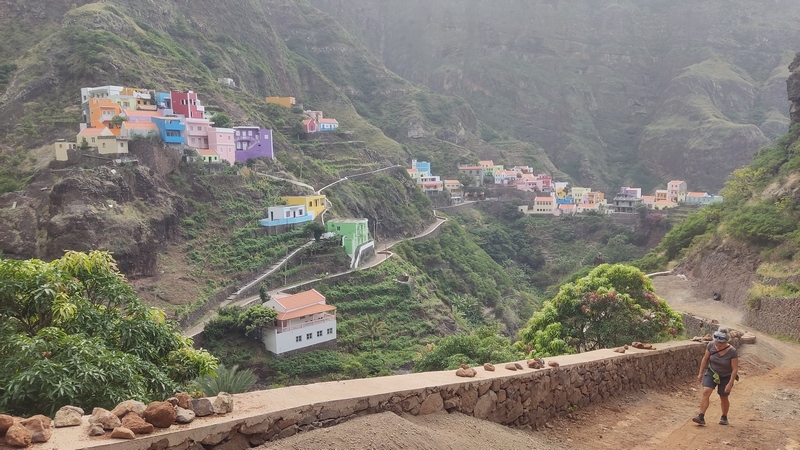 Un kilómetro después viene Corvo, un pueblecito desde donde empieza una exigente subida hasta Fontainhas, un grupillo de casas de colores encajadas en el cañón que forma la montaña frente al mar. Durante la ascensión pueden apreciarse las terrazas de cultivo, que haciendo equilibrios imposibles, invaden el valle. La exigente subida está amenizada por catorce pequeñas capillas con imágenes que nos recuerdan los catorce pasos del Vía Cruzis, al que tuvo la idea hay que reconocerle un fino sentido del humor. El final del pueblo conecta con la carretera, donde hay vehículos que recogen a algunos viajeros para ahorrarles los dos últimos kilómetros hasta Ponto do Sol. Por suerte aun nos quedan fuerzas para acabar el trayecto andando.