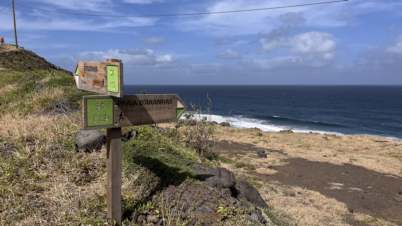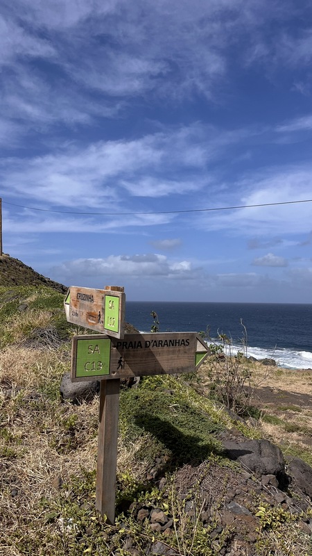 La ruta, que sigue prácticamente todo el tiempo paralela a la costa por un camino peatonal, sale de Cruzinha da Garza, un pequeño pueblo de pescadores, con un bonito puerto rodeado de casas decoradas con graffitis muy coloridos, de temática marinera la mayoría de ellos. Los dos primeros kilómetros siguen una pista ascendente de tierra que acaba en la Praia de Aranhas, una extensa y solitaria playa de arena negra. A partir de aquí comienza un espectacular camino empedrado que sigue el acantilado, dibujando continuos zigzag, subidas y bajadas. A mitad de camino está Formiguinhas, un minúsculo pueblo, con una iglesia y dos mini bares donde beber y comer (prato do dia) con fantásticas vistas sobre el océano.