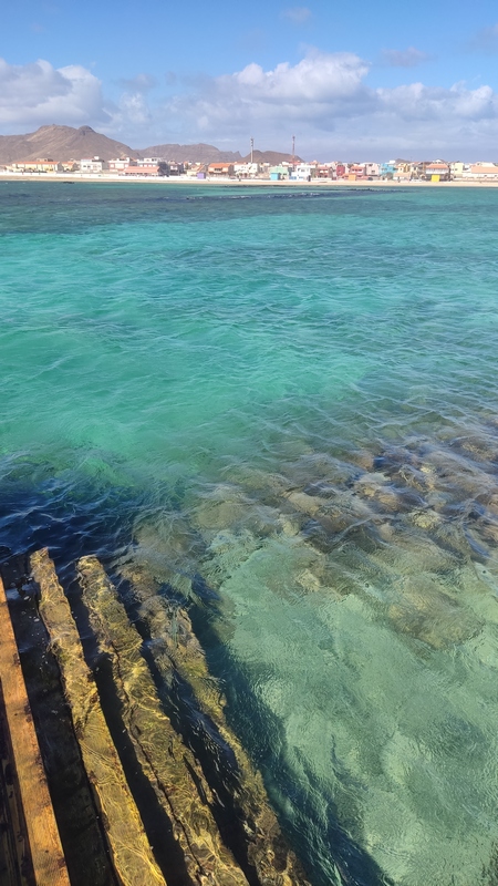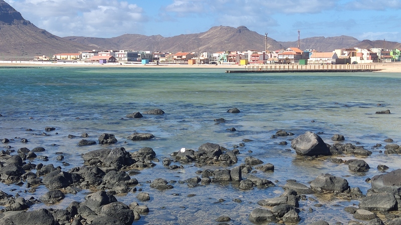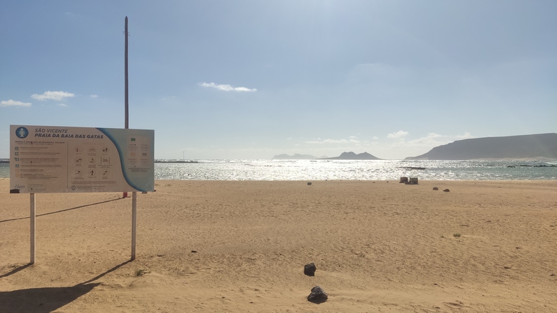 Baia Das Gatas es una población a 8 km de Mindelo, famosa por albergar un festival de música africana que se celebra la primera luna llena de agosto. La playa es una bonita piscina natural de grandes dimensiones, flanqueada por rocas que forman una barrera frente al océano, ausencia de olas altas y poca profundidad del agua, la hacen ideal para nadar. En este espigón natural hay escalones que facilitan el acceso a las aguas color turquesa. Hay un chiringuito restaurante que supongo estará abierto en temporada estival. La carretera que sigues hasta Calhau bordeando la costa está salpicada de