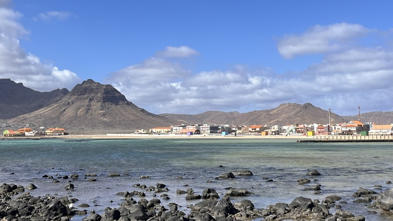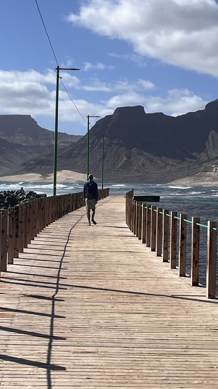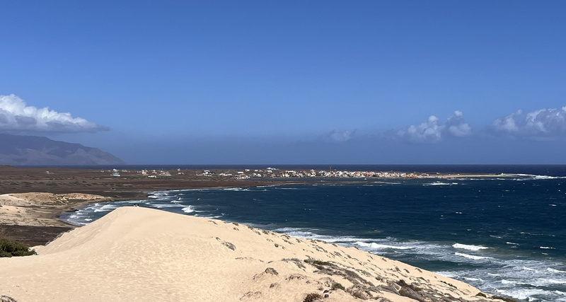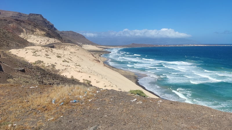 Poco más adelante, otro mirador, ofrece unas vistas espectaculares sobre Praia Grande, una amplia extensión de arena interminable bañada por olas grandes y fuertes corrientes. Un lugar aislado y de difícil acceso en comparación con otras playas próximas a núcleos de población, donde disfrutar del viento y la naturaleza a tus anchas. A 19 km de Mindelo se encuentra la aldea costera de Calhau, un pueblo de pescadores donde se encuentran algunas de las mejores playas de la isla. Al fondo, 10 km mar adentro, se ve la deshabitada isla de Santa Luzia.