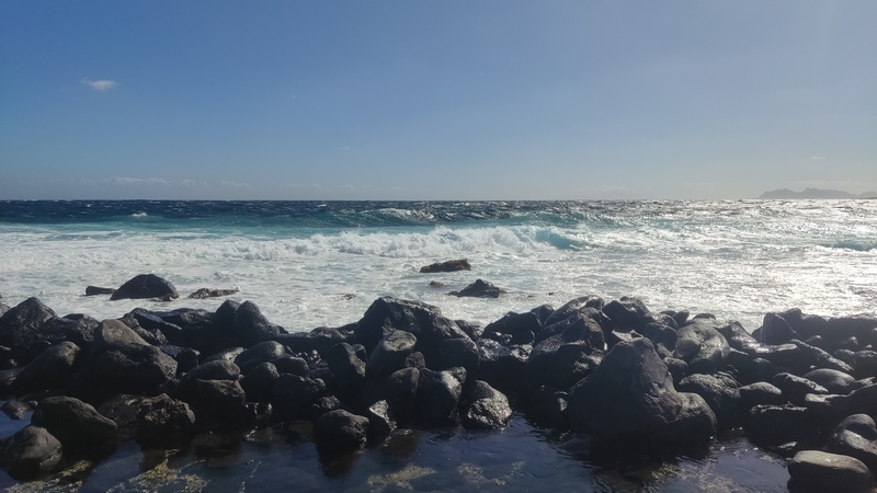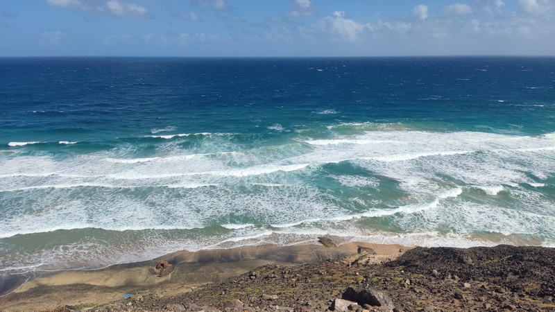 Sandy Beach, pero los últimos cuatro kilómetros son por pista de arena y piedra, con la moto y el viento que hace no nos apetece correr el riesgo de quedarnos varados en la arena, y volvemos a Mindelo por la carretera del interior de la isla.