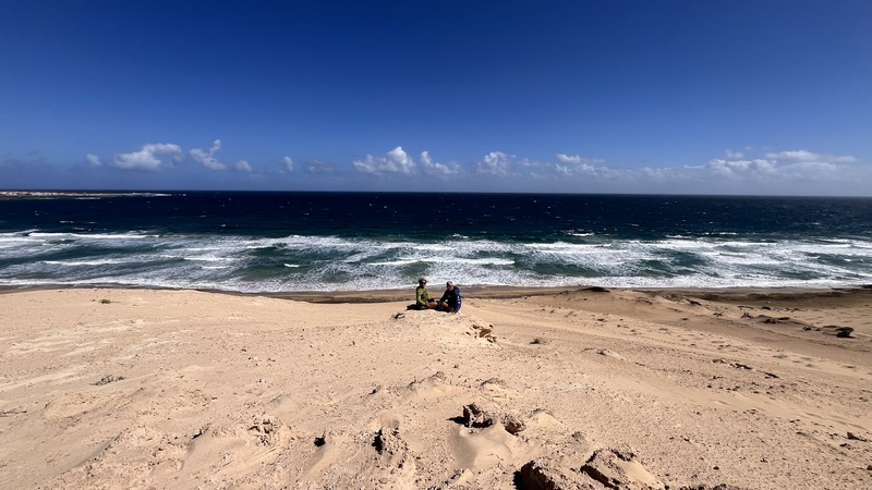 Praia de San Pedro, al final de la pista del aeropuerto. En esta playa los pescadores locales organizan excursiones con sus barcas para avistar tortugas. Fuimos con la idea de verlas desde la playa, haciendo snorkel, pero hace bastante viento y el mar está muy movido, no parece recomendable adentrarse demasiado.