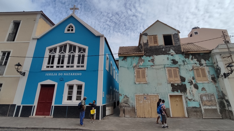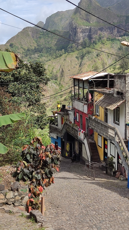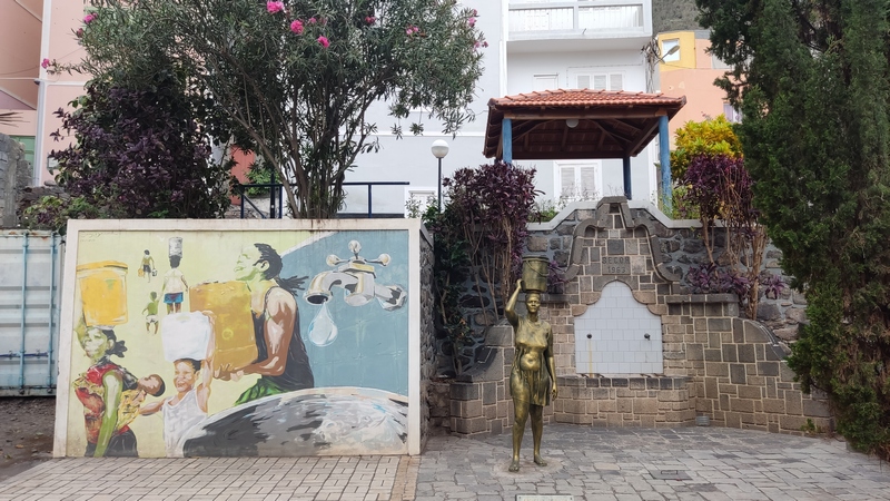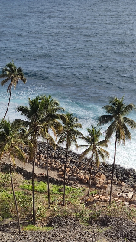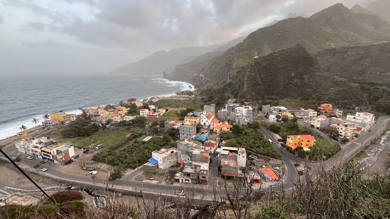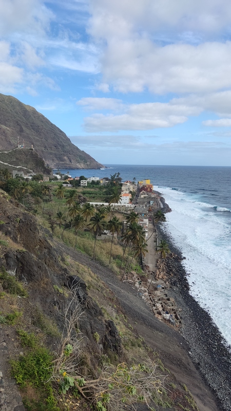 Desembarcamos en Porto Novo, una población sin ningún interés turístico. En la propia terminal hay coches de alquiler, taxis, servicios de grupos organizados y aluguers. Tomamos uno a Paul, el trayecto dura poco menos de una hora y cuesta 350 escudos por persona. Paul (Pombas) es un pueblecito alargado, paralelo a la costa, con una docena de hoteles y restaurantes, y media docena de pequeñas tiendas de abastos. El ambiente es relajado, las vistas del mar son espectaculares, y aunque no es ideal para el baño, pues es bastanteo bravo y no hay playas, si que vimos algunos locales haciendo bodyboard surf. Merece la pena subir hasta lo alto de la colina donde se encuentra la estatua de San Antonio das Pombas, unos 200 escalones, y disfrutar de unas bonitas vistas del pueblo al atardecer.