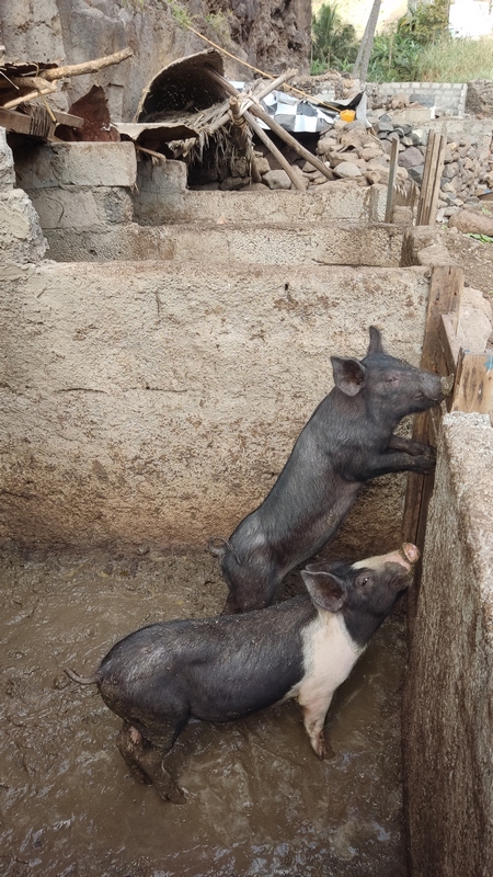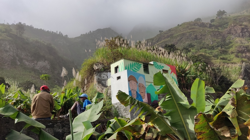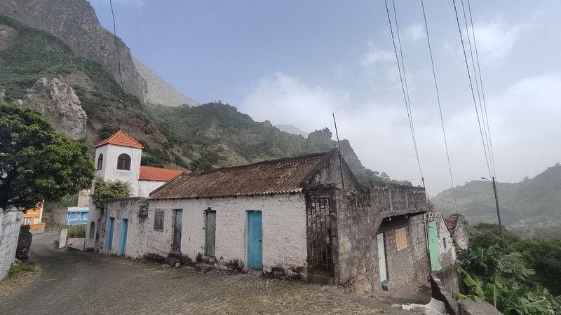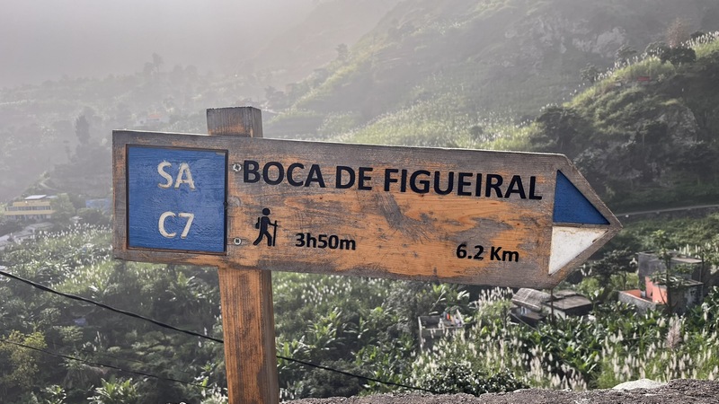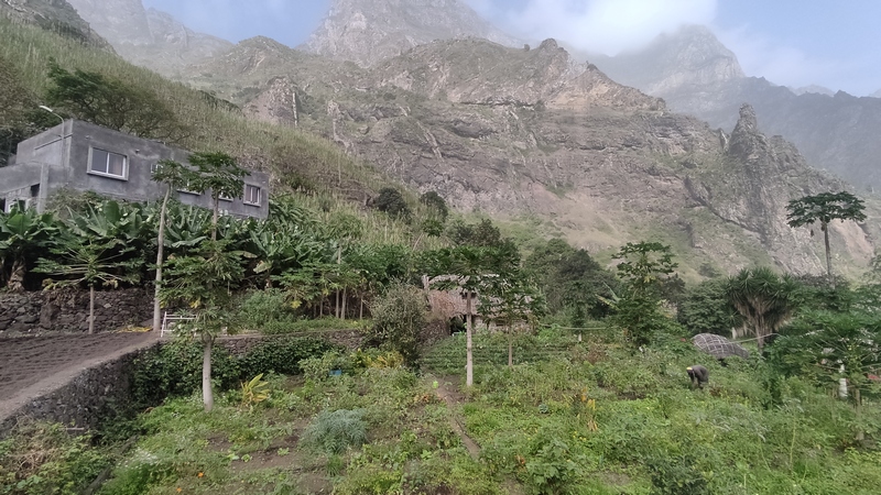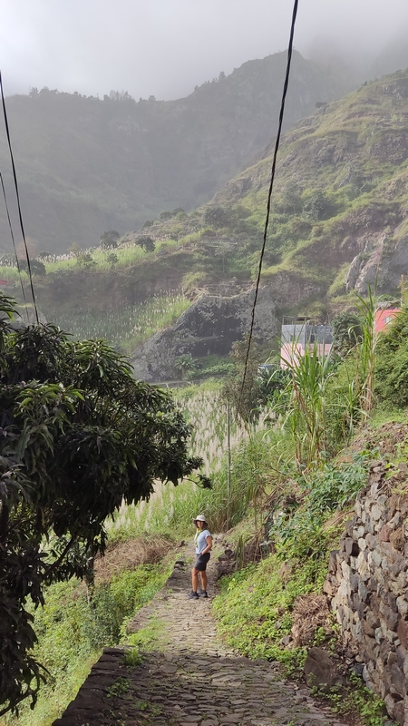 Caminata desde Cha de Padre a Paul (Pombas). Esta ruta puede hacerse en ambos sentidos, desde Paul es ascendente, desde Cha de Padre es descendente. En nuestro caso tomamos un aluguer hasta Cha de Padre (20 minutos, 200 escudos cada uno). El conductor nos deja al final del pueblo, entre dos carteles, uno señala la ascensión al Volcán de Cova, el otro es un sendero vecinal que lleva de vuelta hasta Paul. Lo seguimos durante unos 1000-1500 mts, cruzamos algunas casas y campos de cultivo, paralelos al cauce de un riachuelo.