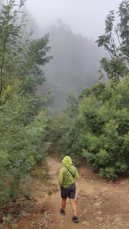 Al llegar arriba hace bastante frío, viento y niebla, hay que descender unos cuantos metros entre tinieblas para poder ver el cráter. Al principio, el camino, que va rodeando el cráter, desciende ligeramente. Cada minuto la niebla cambia, cuando llevamos más de veinte minutos de descenso el tiempo mejora y se despejan las vistas... Ante nosotros, una caldera de color verde intenso, donde las tierras de cultivo comparten espacio con vacas y otros animales de granja, rodeados por las crestas del cráter Desde el suelo de la caldera se inicia el- único tramo empinado de todo el trekking. Para cuando acaba la subida ha pasado una hora, por primera vez se ve el mar al fondo del valle.