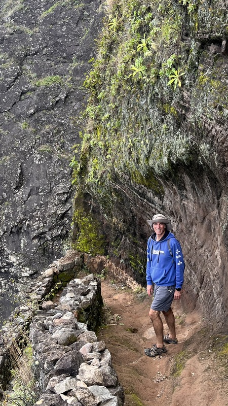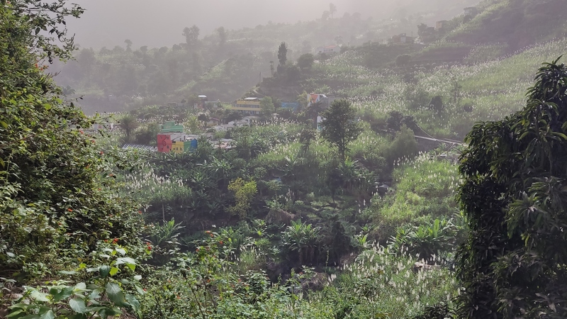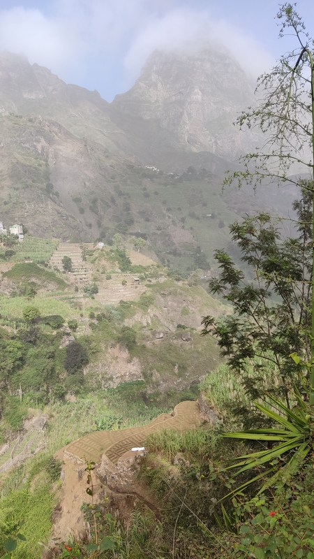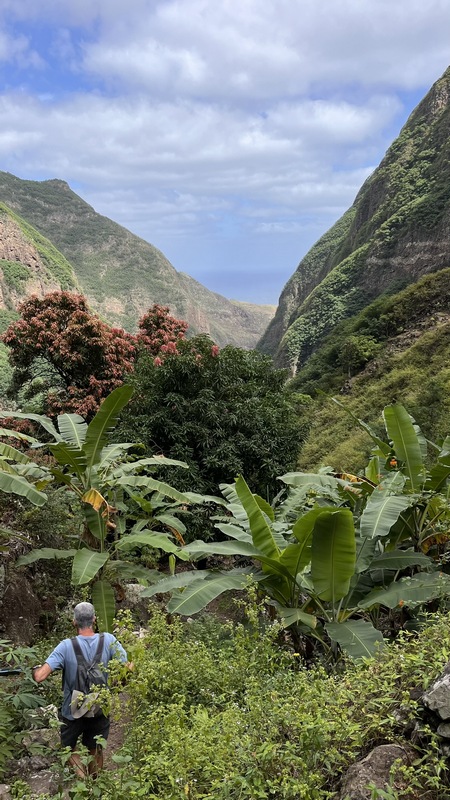 Desde aquí hay 1.300 mts de desnivel y unos 15 km de distancia hasta Paul. Empieza un empinado descenso por un estrecho y vertiginoso camino de tierra empedrado. Las vistas son espectaculares, curva tras curva el sinuoso sendero nos ofrece unas vistas espectaculares del valle y el mar al fondo. Tras una hora de descenso, aparecen un par de cabañas de agricultores locales donde venden agua, refrescos, te, café o fruta, y puedes parar a descansar un poco. El paisaje cambia, las estrechas terrazas de cultivo dan paso a amplias plantaciones de café, caña de azúcar, plataneros, mangos, aguacate... Una hora más y llegamos a