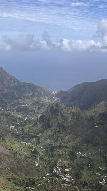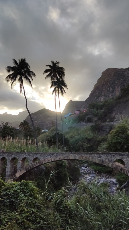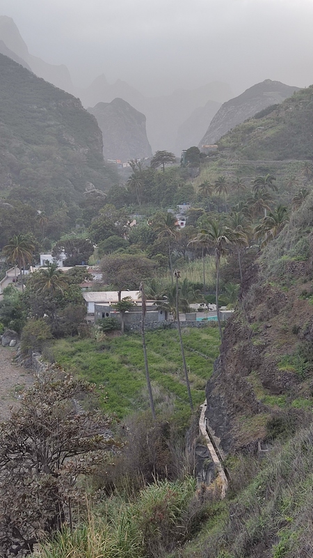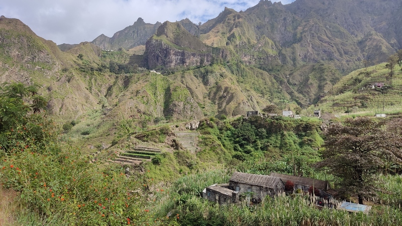 Santo Antao es la más occidental del grupo de barlovento y también la más verde. La zona occidental es seca, árida y está escasamente habitada; en la zona oriental una cordillera cruza la isla de norte a sur alcanzando una altitud de casi 2.000 mts, formando fuentes permanentes de agua, riachuelos, valles y cañones, donde los agricultores locales cultivan caña de azúcar, plátano café, yuca y algunas frutas tropicales en estrechas terrazas, o destilan el