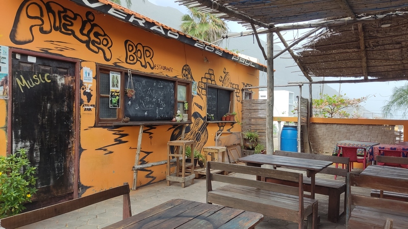 Veleiro II, primera línea de mar, terraza muy agradable, aunque austera, ideal para pasar la tarde. Wifi. Dos tes de menta y queso rebozado con miel, 500 escudos. Gran variedad de cócteles.